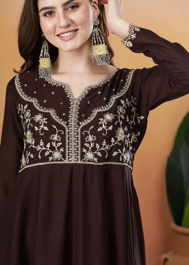 Kanika Designer 3 piece Kurta Set Vichitra Silk With Embroidery Sequence Work Brown Color