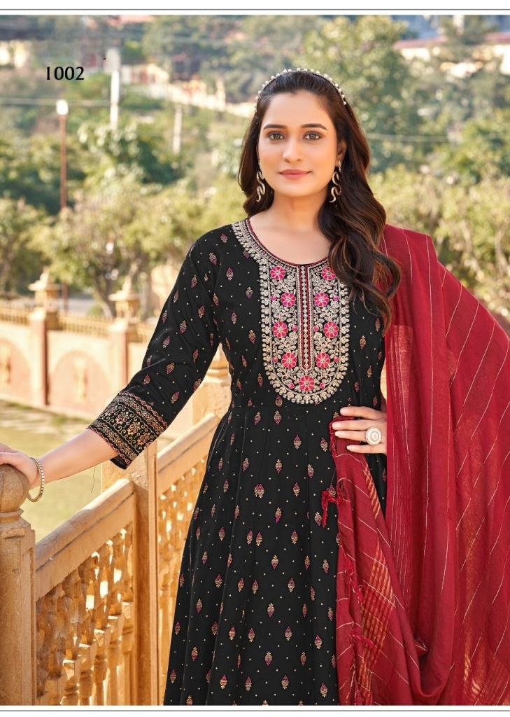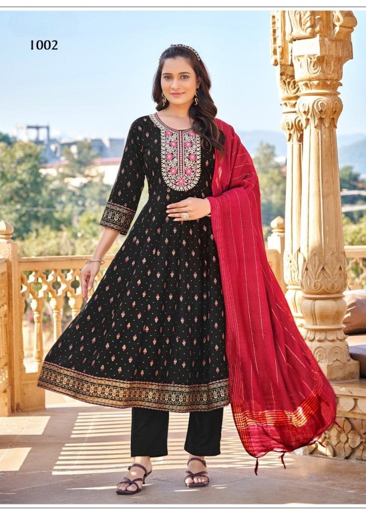 Kanika In 14Kg Rayon Fabric 3 Piece Anarkali Kurti Set With Pant And Dupatta Black Color DN 1002