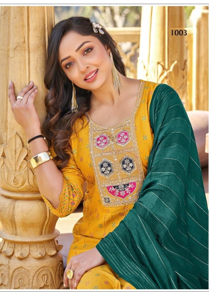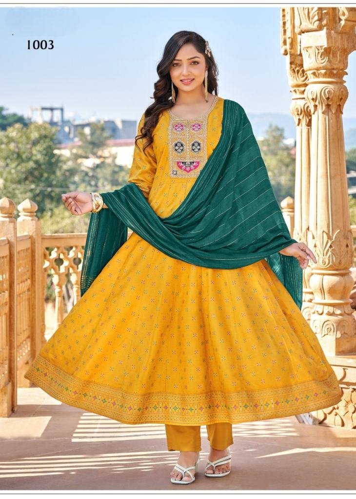 Kanika In 14Kg Rayon Fabric 3 Piece Anarkali Kurti Set With Pant And Dupatta Yellow Color DN 1003