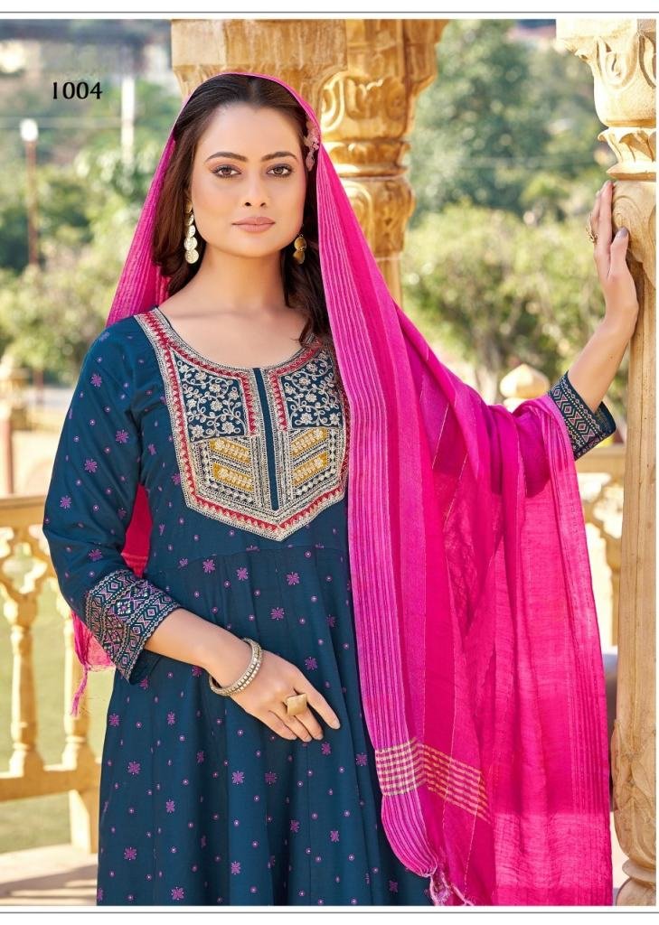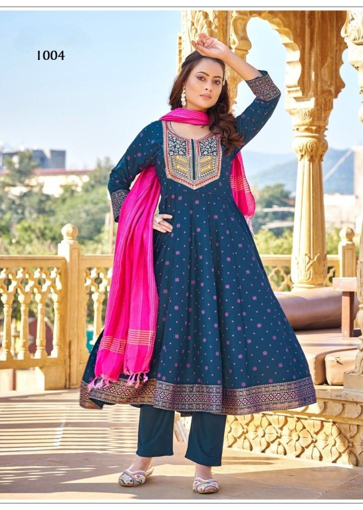 Kanika In 14Kg Rayon Fabric 3 Piece Anarkali Kurti Set With Pant And Dupatta Navy Blue Color DN 1004