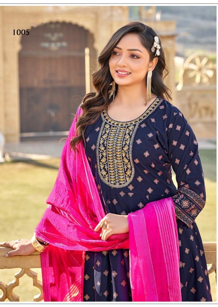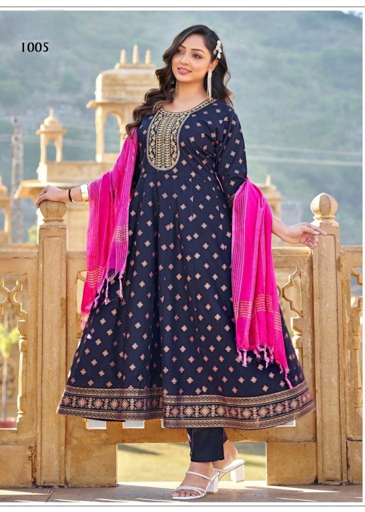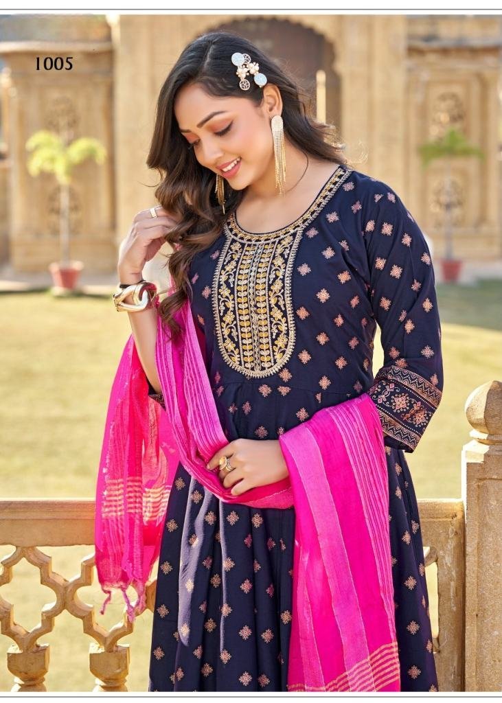 Kanika In 14Kg Rayon Fabric 3 Piece Anarkali Kurti Set With Pant And Dupatta Dark Blue Color DN 1006