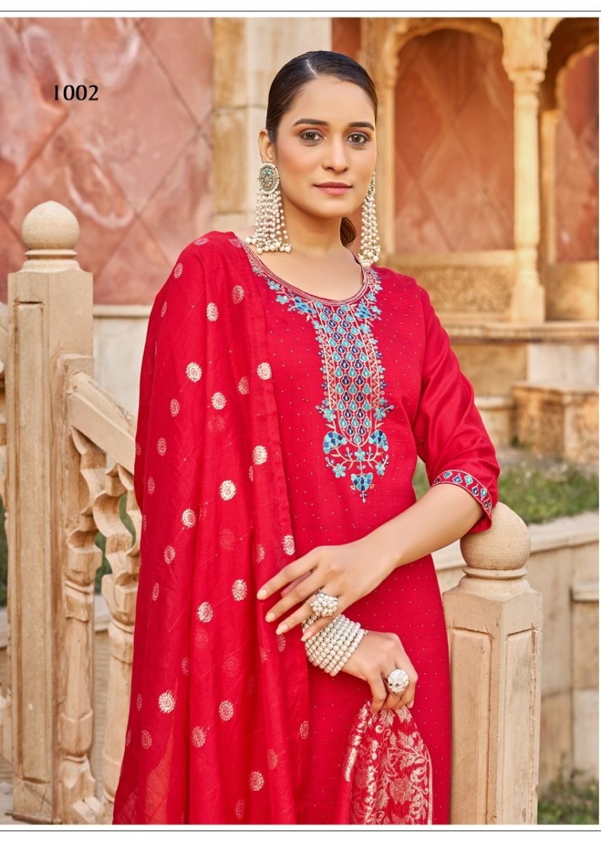 | NAME : | Karissa DN 1002 Designer Vertical Silk 3 Piece Kurti Pant Dupatta Set With Embroidery Sequence And Zarkan Work In Red Color |