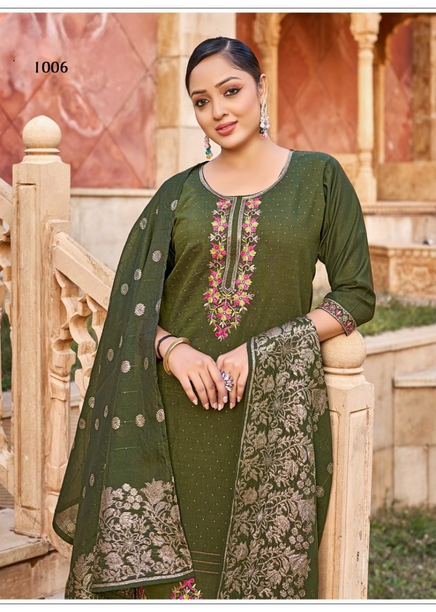 | NAME : | Karissa DN 1006 Designer Vertical Silk 3 Piece Kurti Pant Dupatta Set With Embroidery Sequence And Zarkan Work In Olive Green Color |