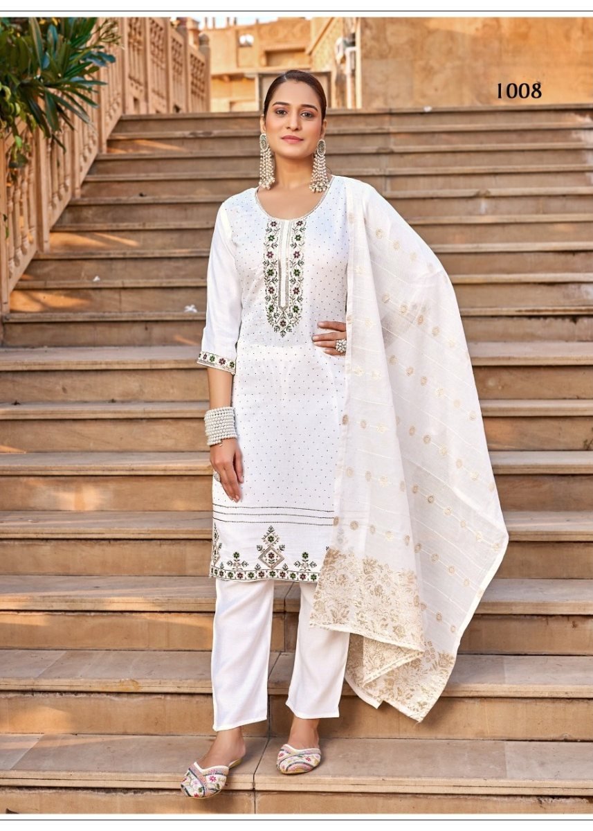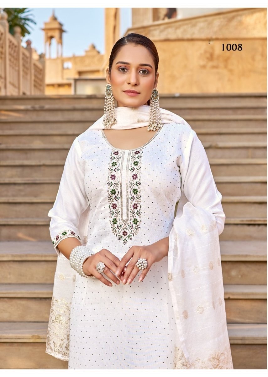 | NAME : | Karissa DN 1008 Designer Vertical Silk 3 Piece Kurti Pant Dupatta Set With Embroidery Sequence And Zarkan Work In White Color |