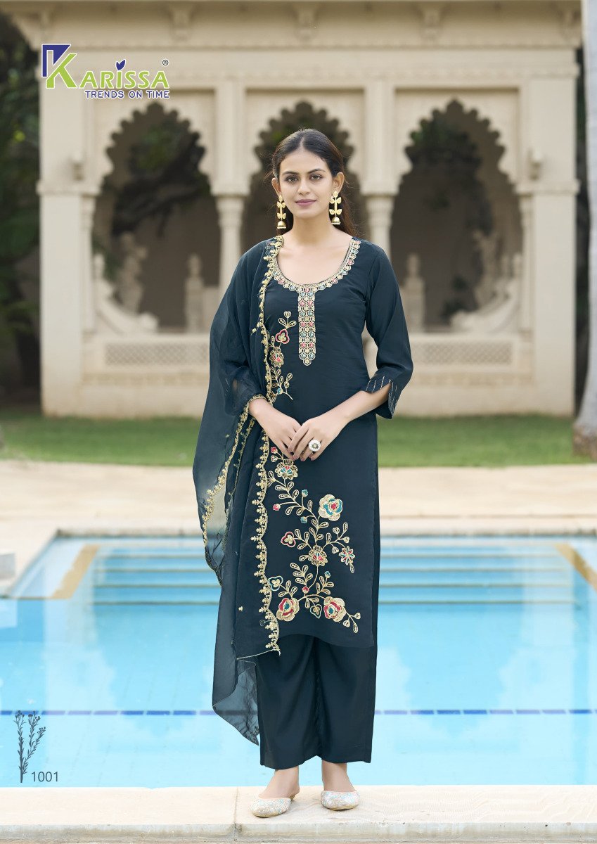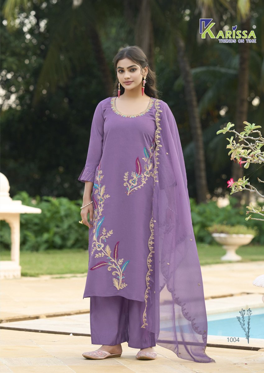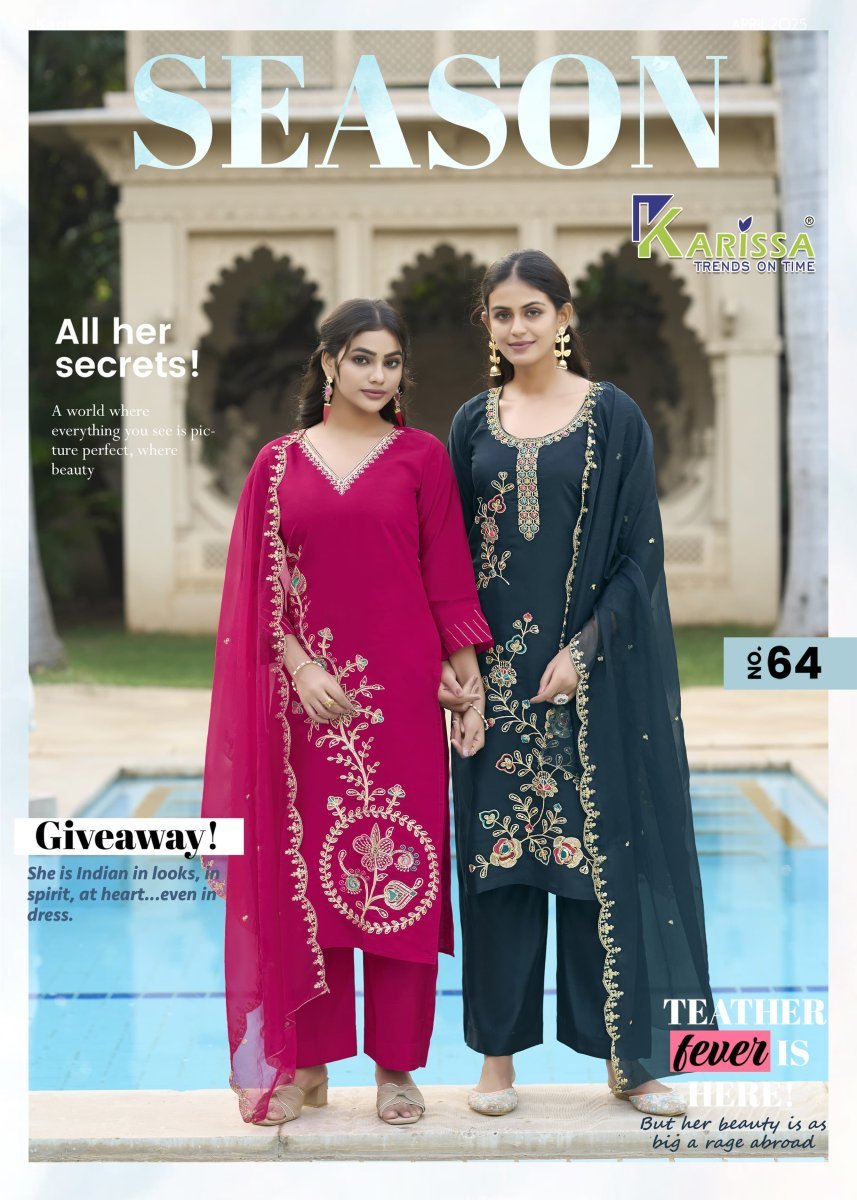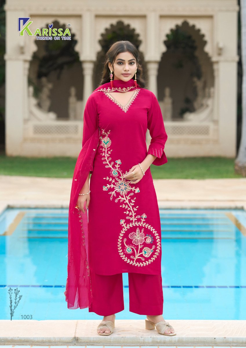 | NAME : | Karissa Season Viscose Roman With Sequence Thread Work Kurti Pant And Dupatta Set |