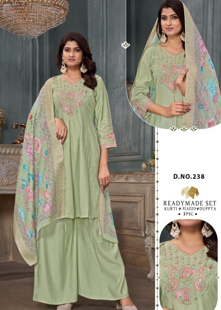 Today Presenting 3 piece Kurta Palazzo Set Roman silk With embroidery and Handwork