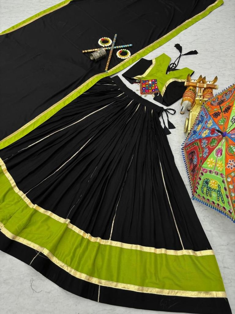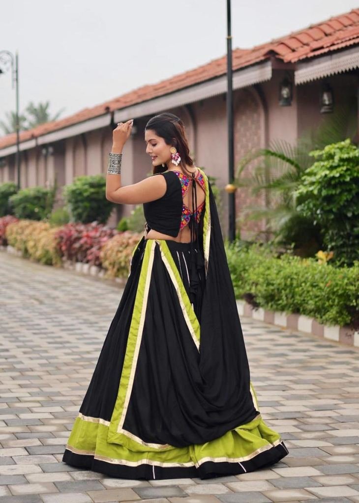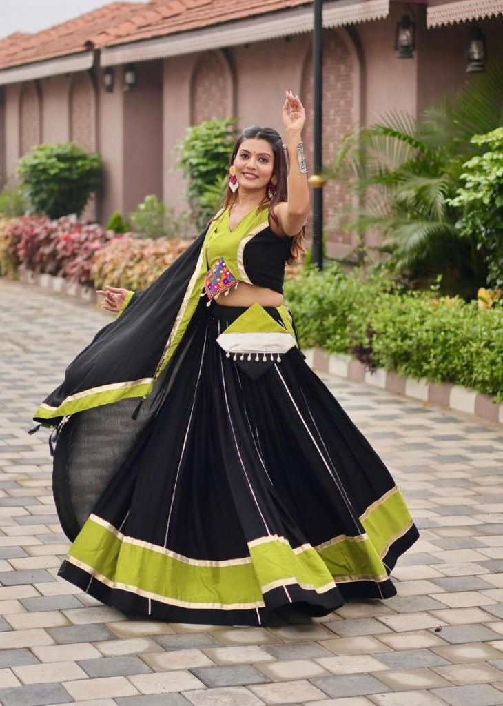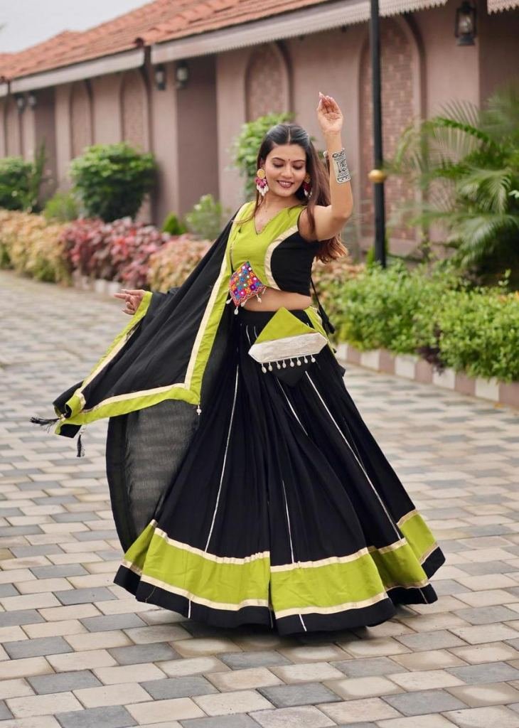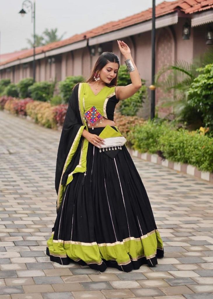 NAME : | Latest Navratri Collection Pure Cotton And Lumpi Lace Border With Blouse Heavy Gamthi Work Lehenga Choli Black Color |