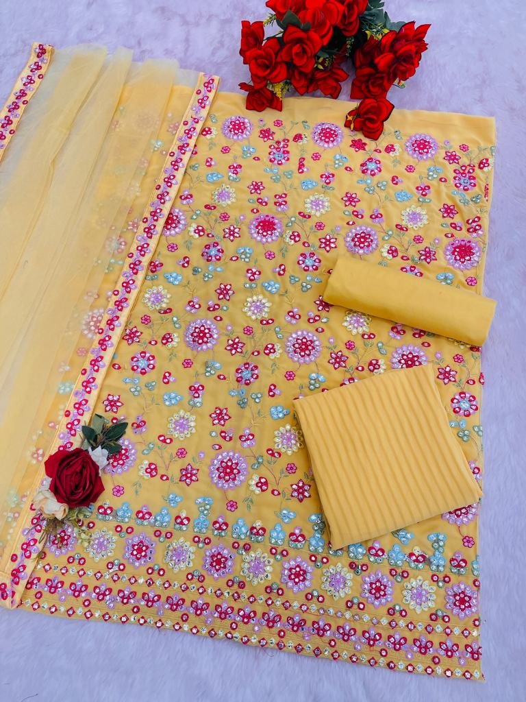 | NAME : | Latest Wedding Collection Faux Georgette With Heavy Embroidered And Multi Thread Work Sharara Suit Yellow Color DN 1004 |