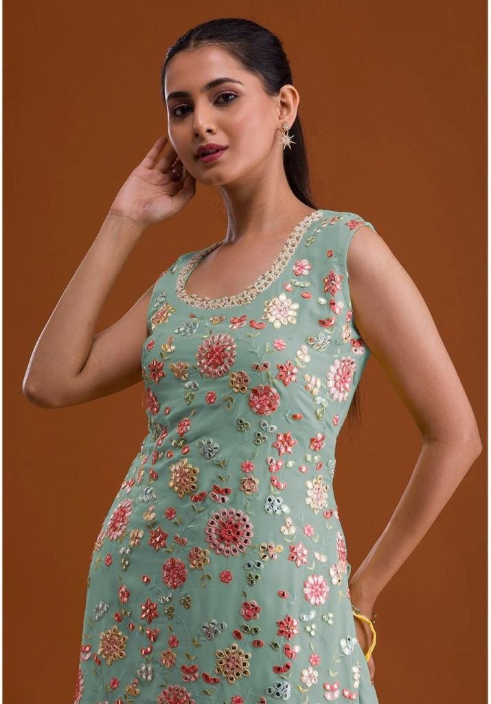 NAME : | Latest Wedding Collection Faux Georgette With Heavy Embroidered And Multi Thread Work Sharara Suit Sky Blue Color DN 1004 |