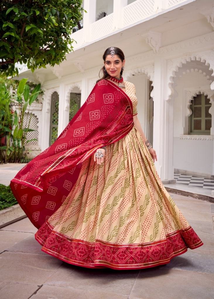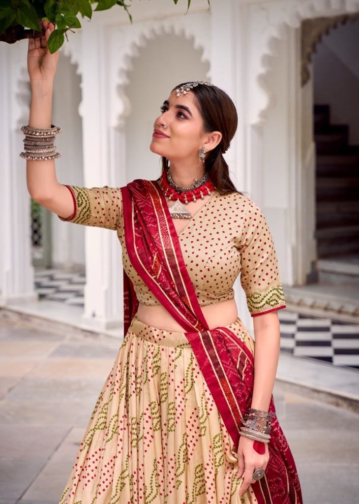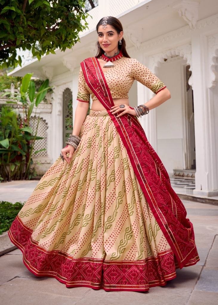 | NAME : | Lfh Lnb Classic Tussar Silk Bandhej Lehenga Choli Enhanced With Gotta Patti Lace Beige Color DN 1250 |