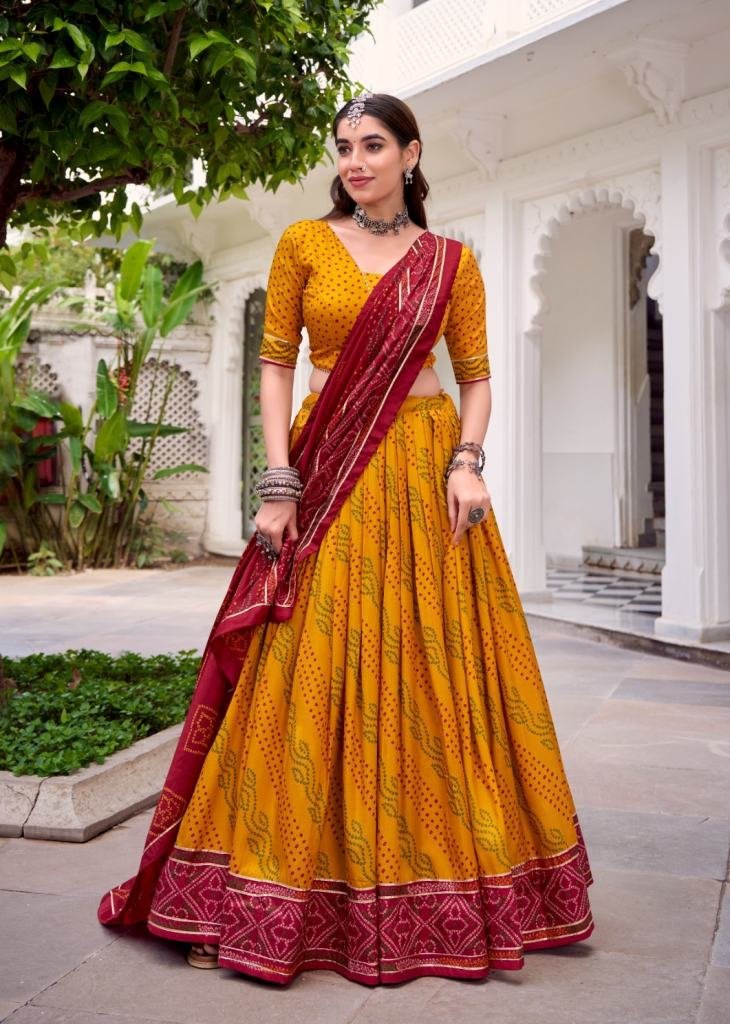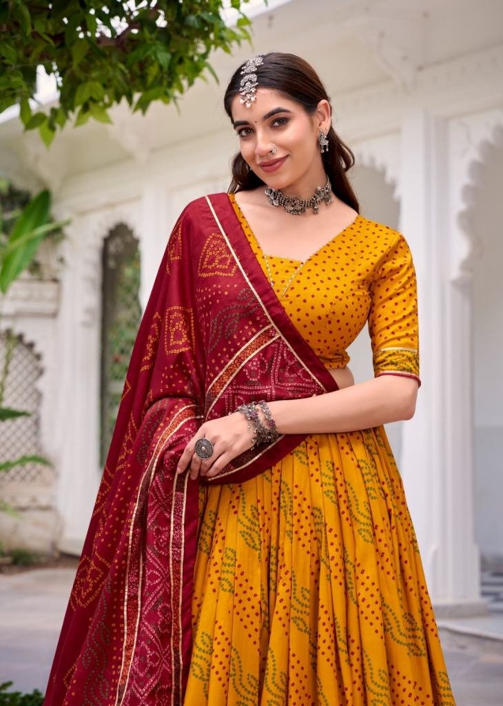 | NAME : | Lfh Lnb Classic Tussar Silk Bandhej Lehenga Choli Enhanced With Gotta Patti Lace Mustard yellow Color DN 1250 |
