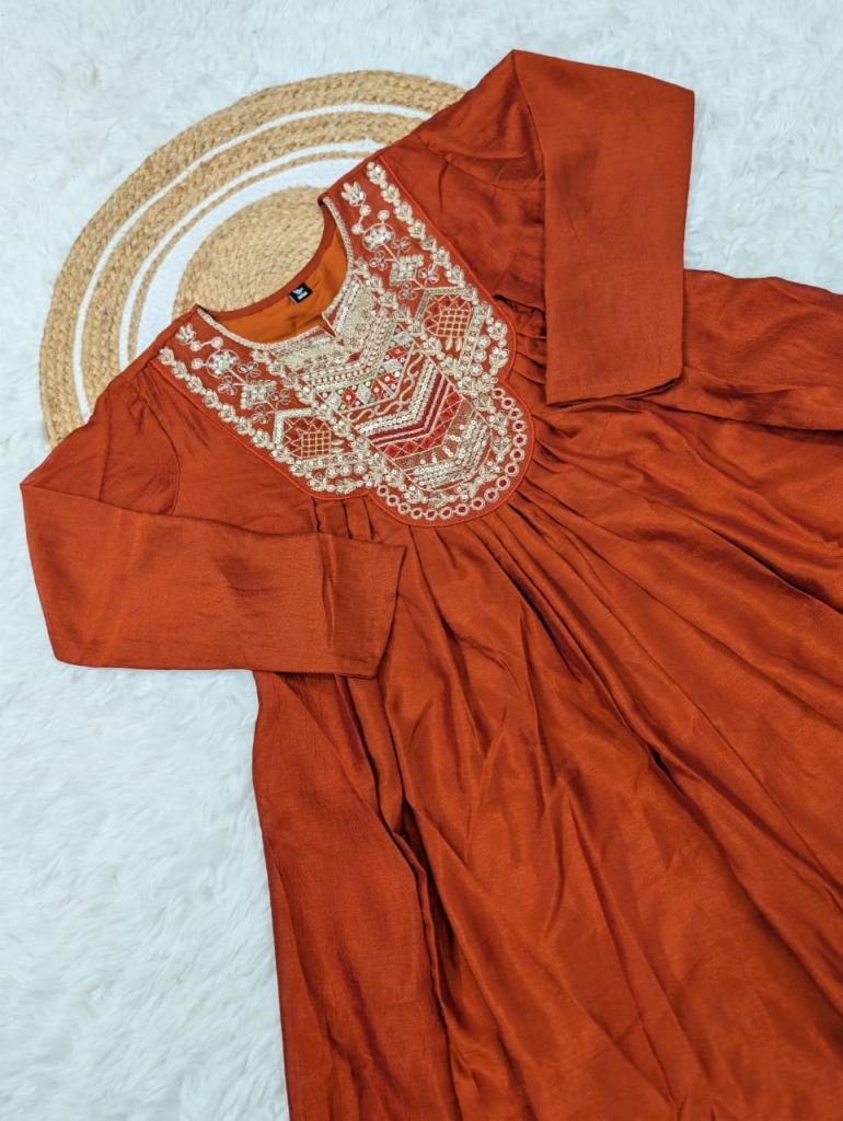 | NAME : | Lipsa 2 Premium Designer Pure Vichitra Silk 3 Piece Anarkali Kurti Pair With Sequence Embroidery Rust Orange Color |