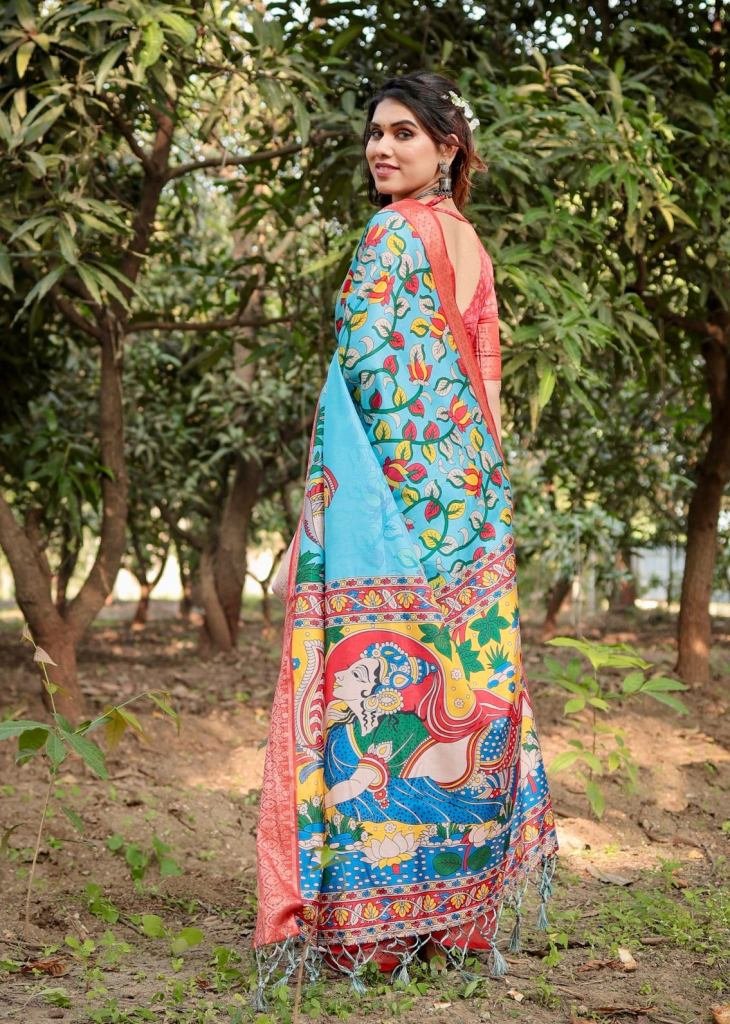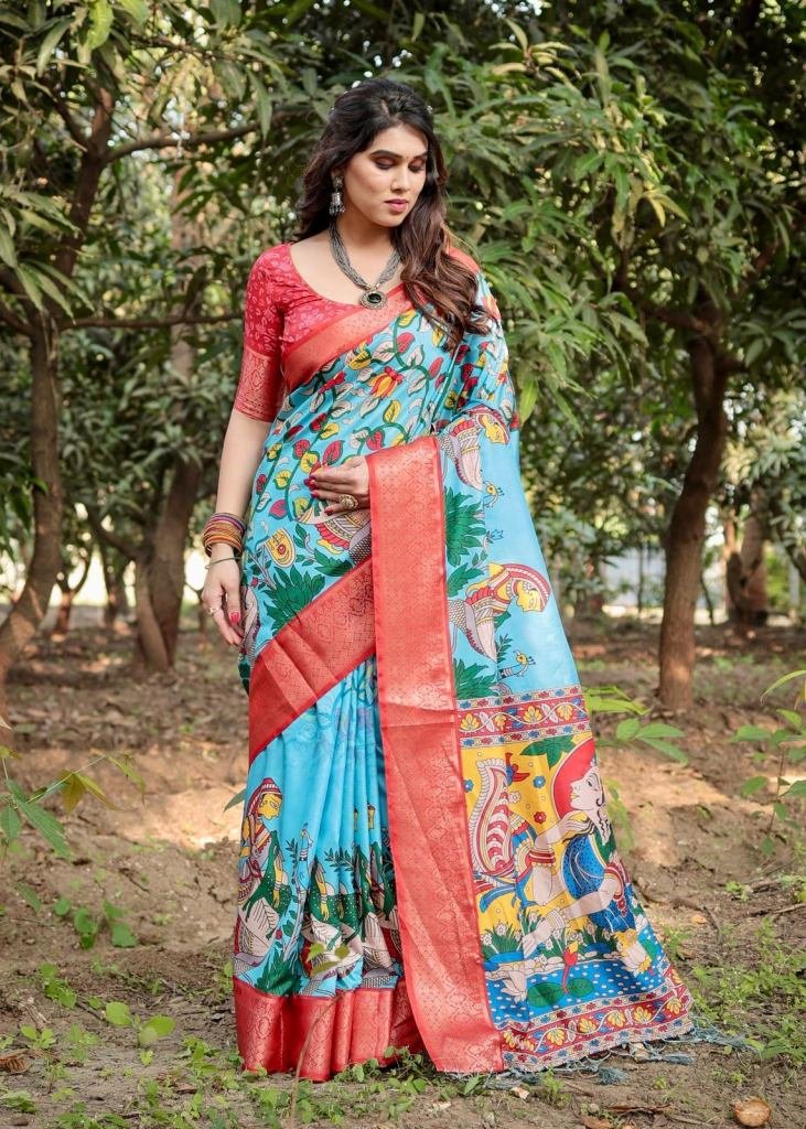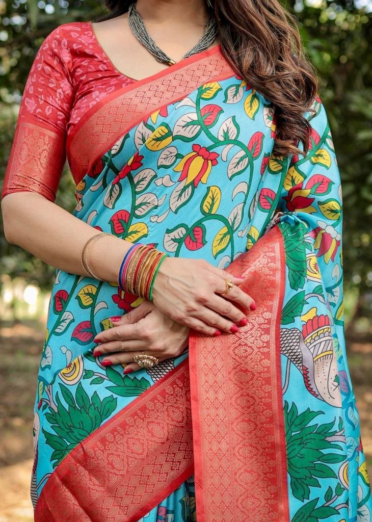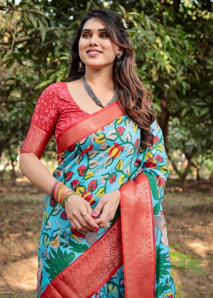 Color : Sky Blue base with a striking Red Zari Border featuring vibrant floral & peacock motifs