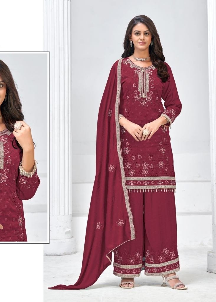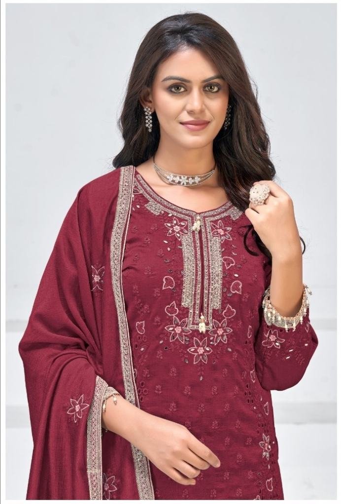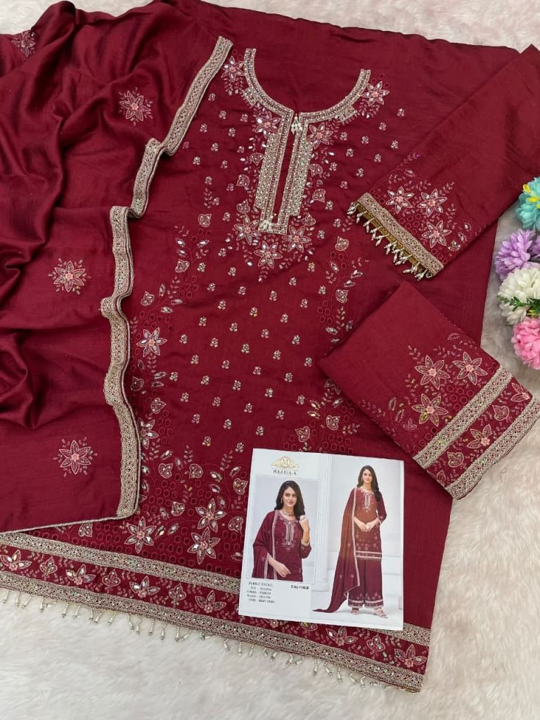 | NAME : | Maaria A Designer Premium Heavy Vichitra Embroidery Sequence Work With Zarkan Work Pakistani Suit Maroon Color DN 1186 |