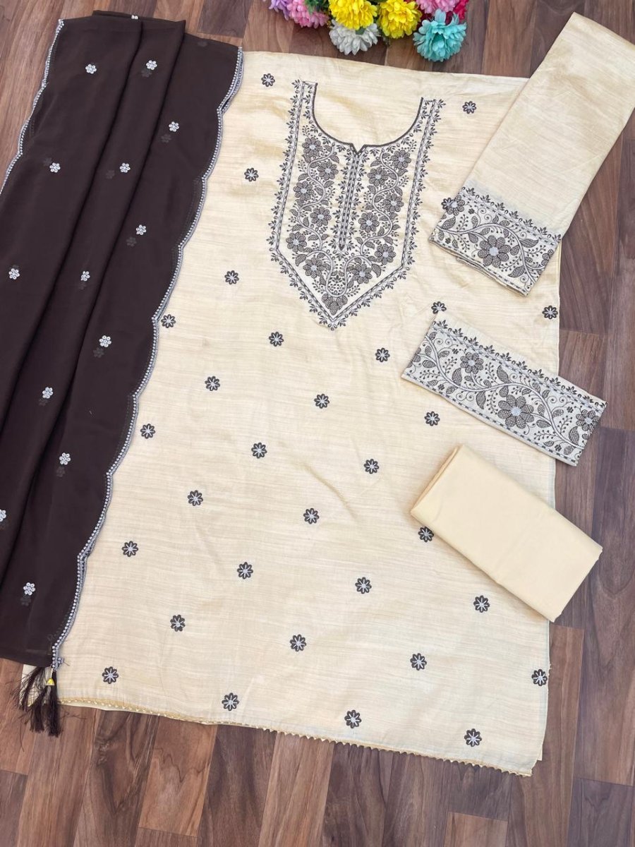| NAME : | Mah E Rooh DN 2110 Khadi Cotton With Embroidery Work Pant Style Designer Suit Off White And Brown Color |
