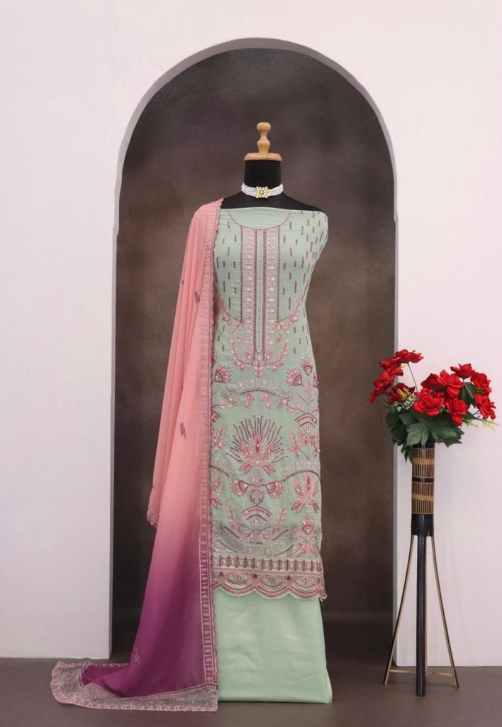 Mah-E-Rooh Faux Georgette Pakistani Suit With Embroidered Sequin And Khatli Work Light Green Color DN 5206