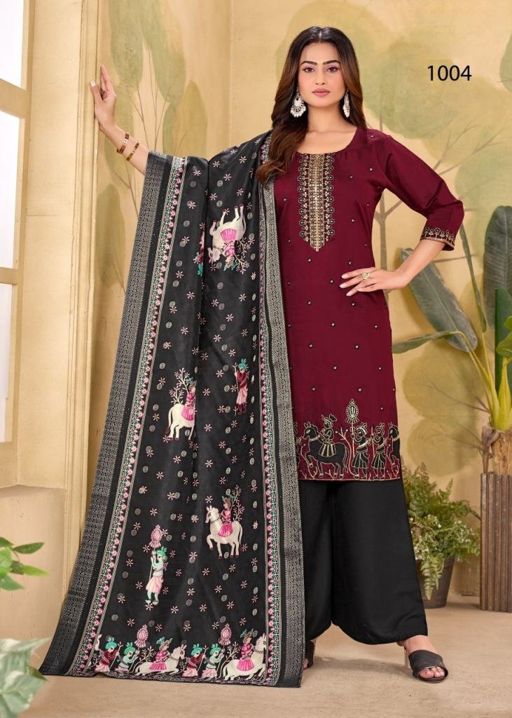 | NAME : | Mahotsav Gadhwal Silk Embroidery Work With Sequence Work Kurti Pant And Dupatta Set Maroon Color DN 1004 |