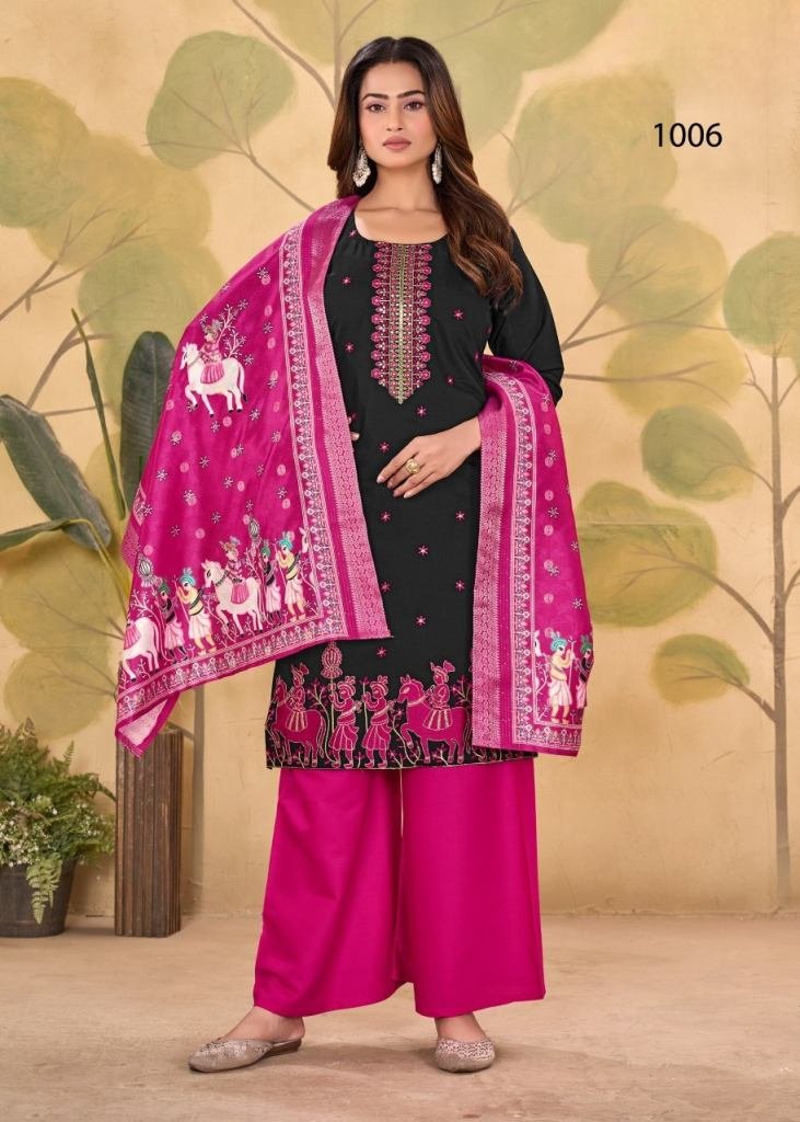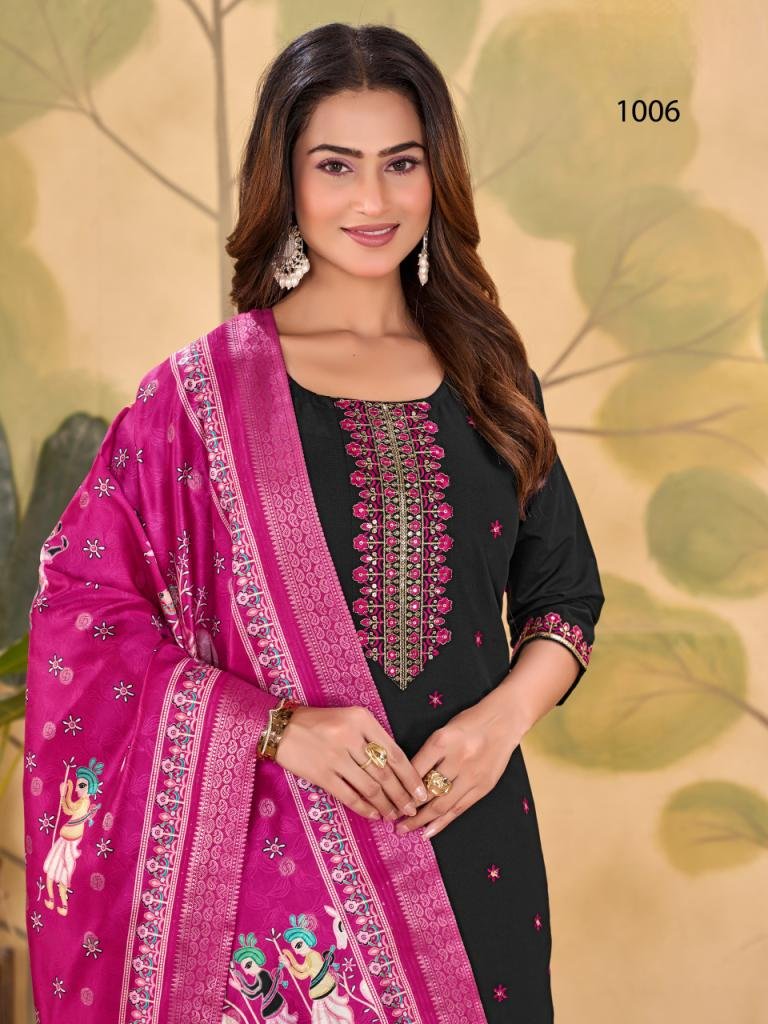 | NAME : | Mahotsav Gadhwal Silk Embroidery Work With Sequence Work Kurti Pant And Dupatta Set Black Color DN 1006 |