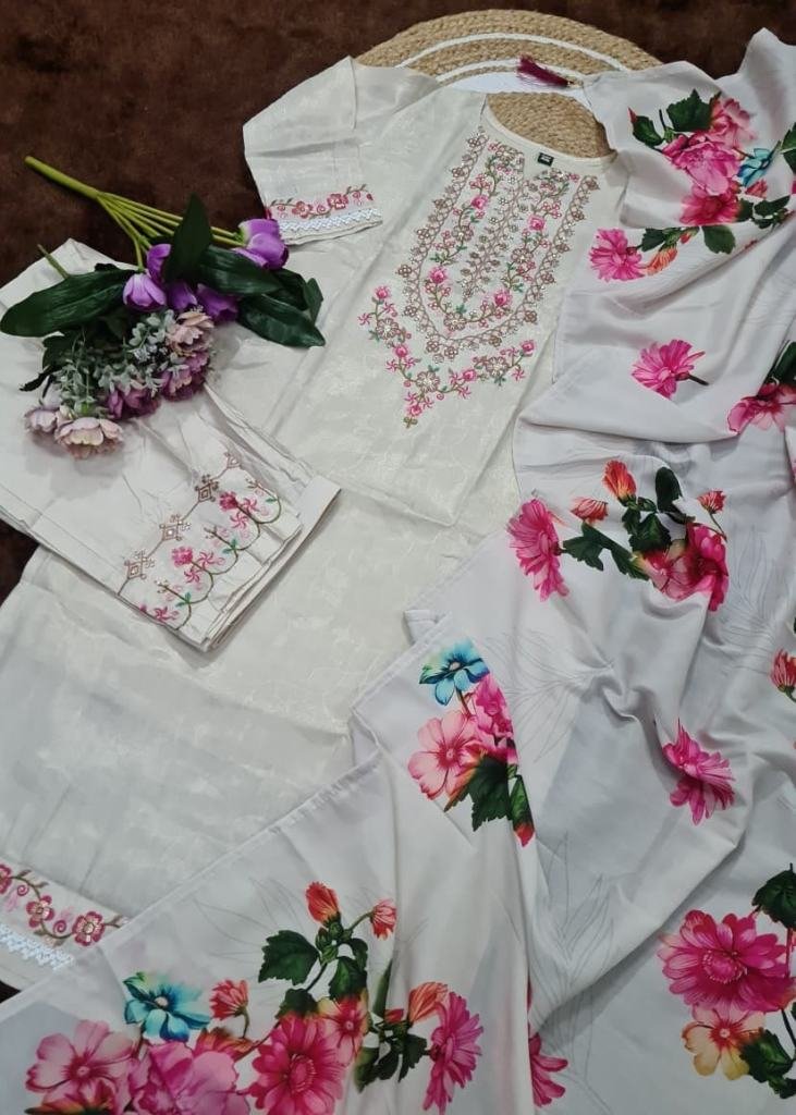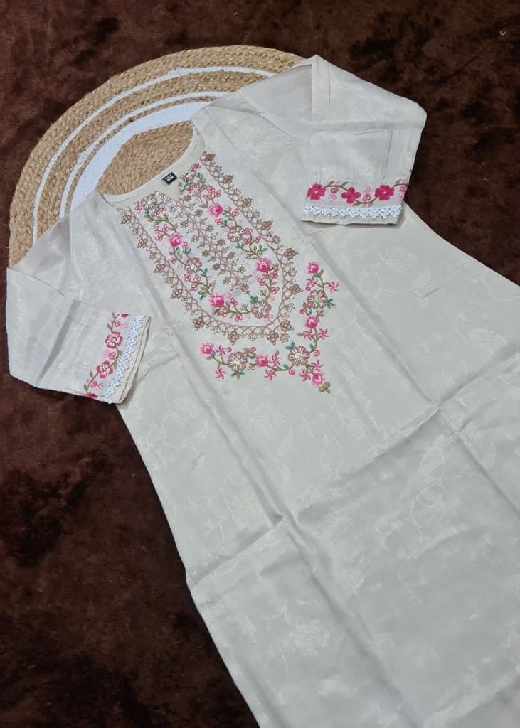 | NAME : | Maitri Presenting Women’s Pure Viscose Jacquard Kurti Pant Dupatta Set With Embroidered Sequence Work Off-White Color |
