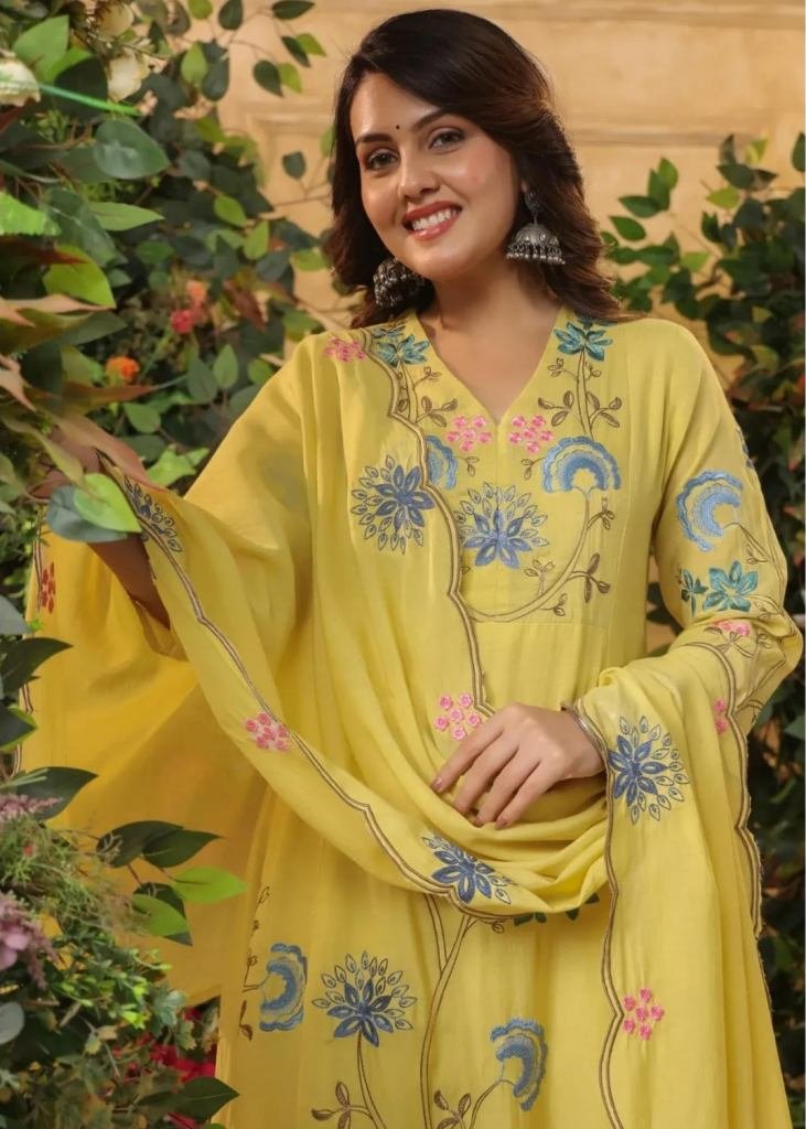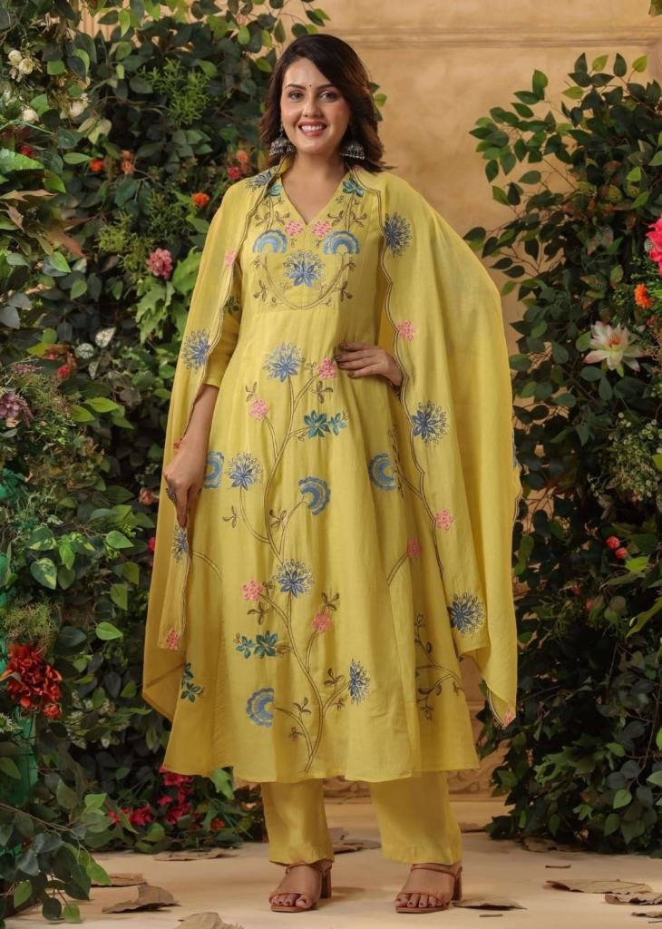 Mannat Pure Viscose Chanderi With Embroidered Anarkali 3 Piece Kurti Set Yellow Color