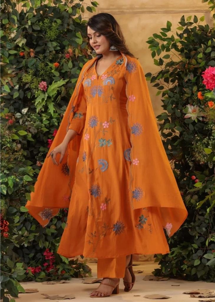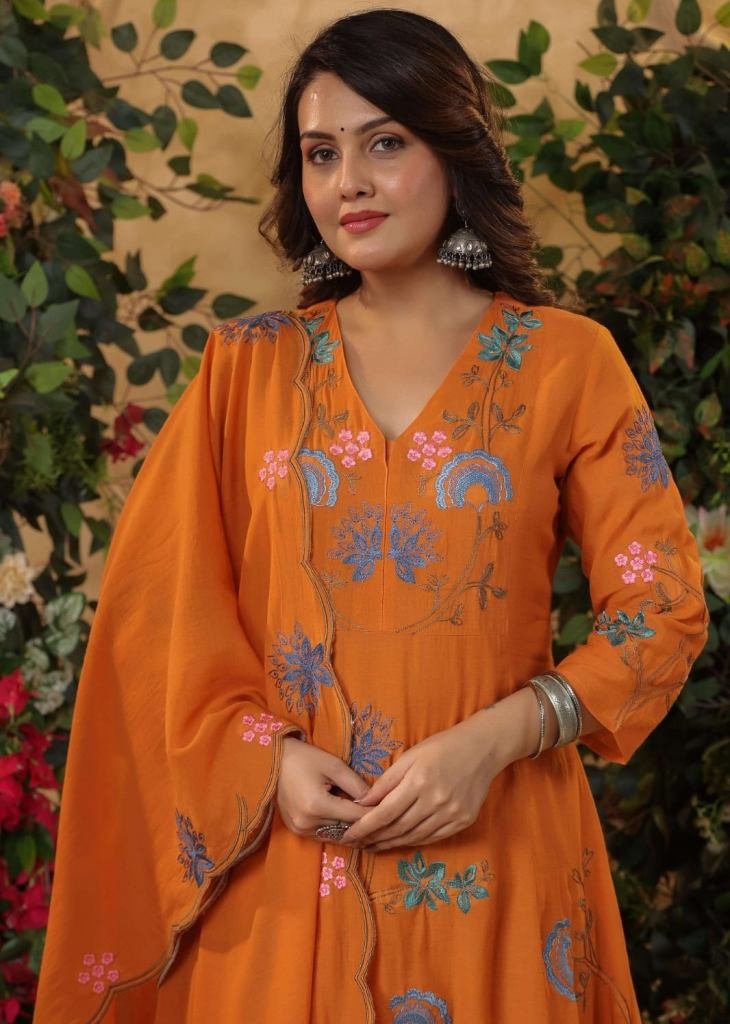 Mannat Pure Viscose Chanderi With Embroidered Anarkali 3 Piece Kurti Set Orange Color