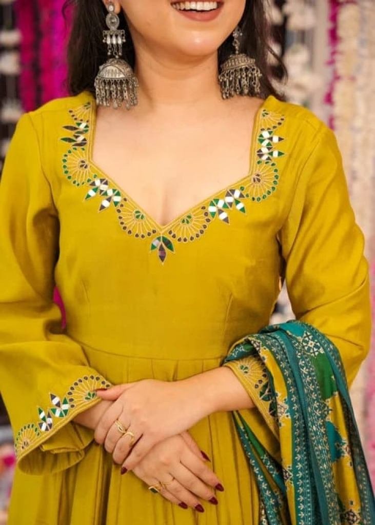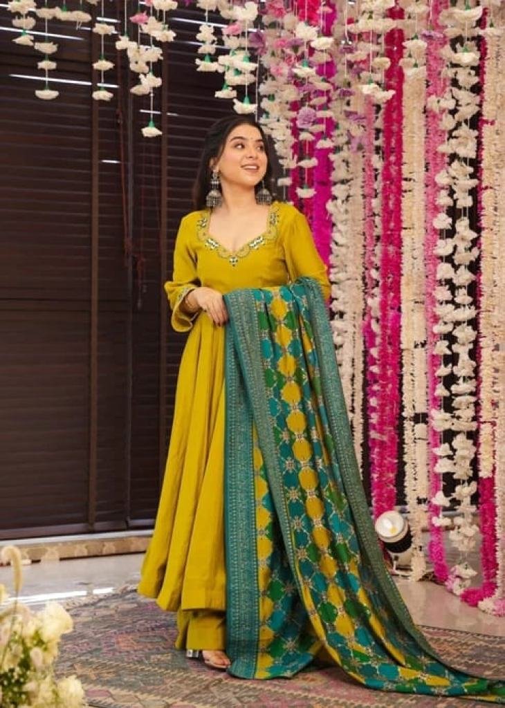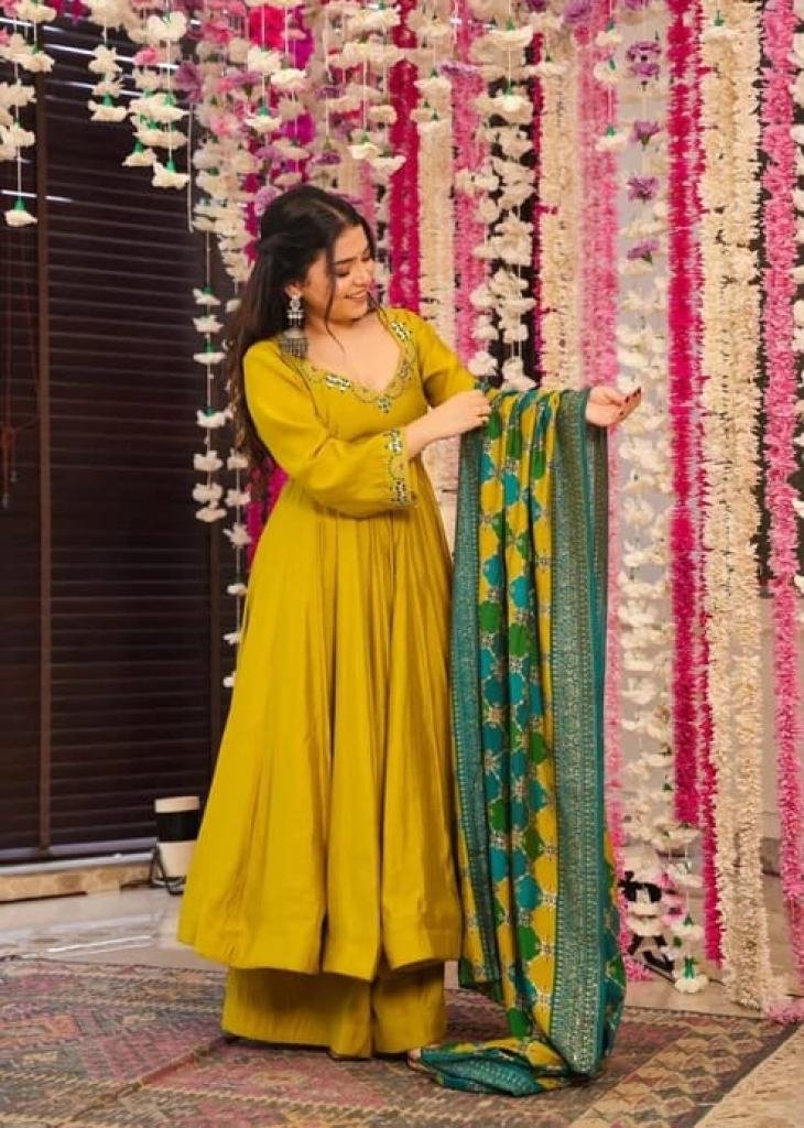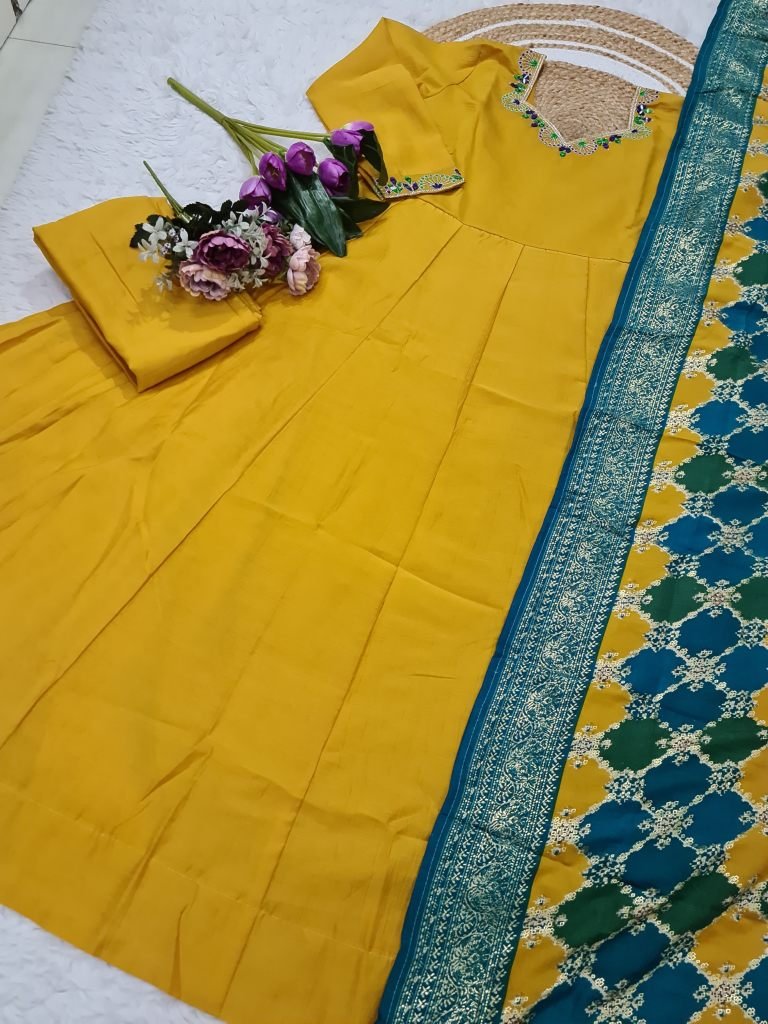 Muskan Our Latest Chanderi Silk With Sequence And Embroidery Work 3 pieces Anarkali Gown Mustard Yellow Color