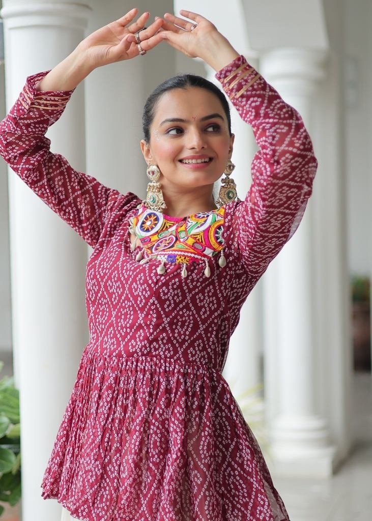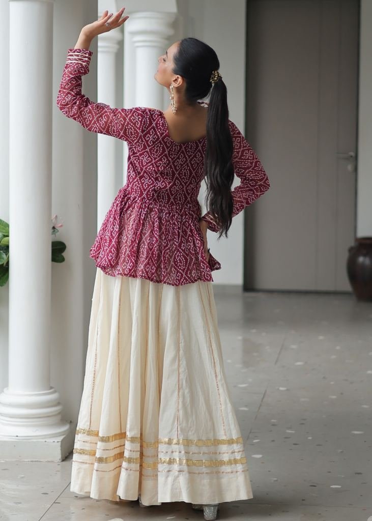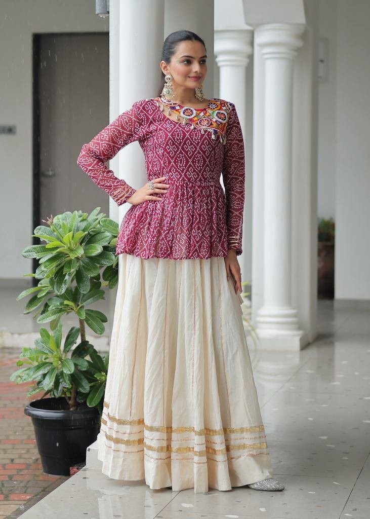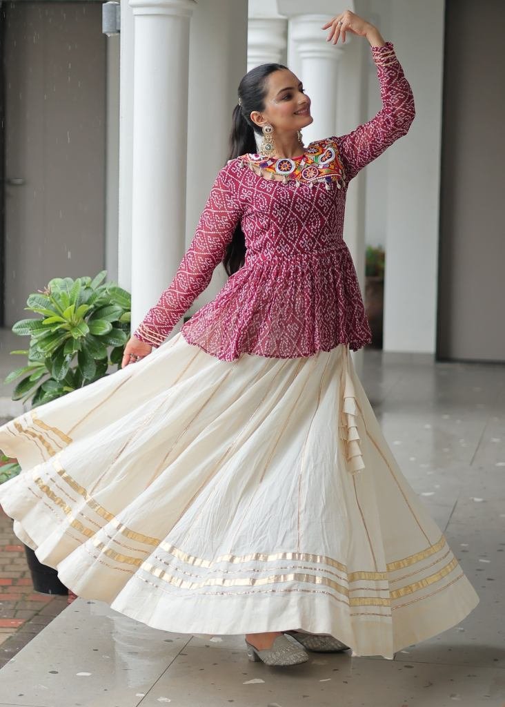 NAME : | Navratri Festival Kora Cotton With Attractive Gota-Patti Lace With Bandhani Print Tops Lehenga Maroon Color DN 1184 |