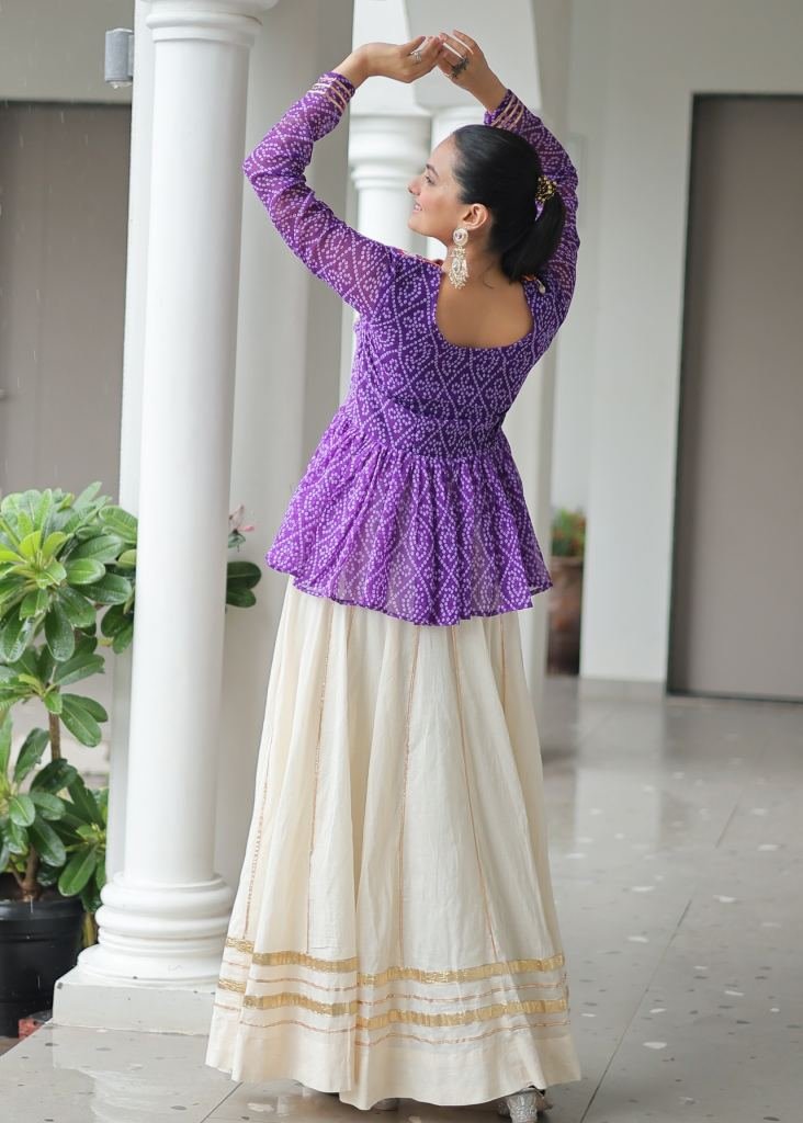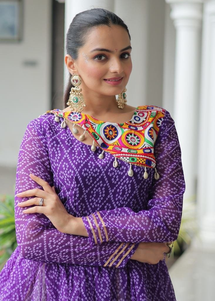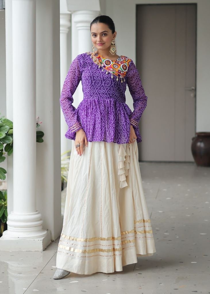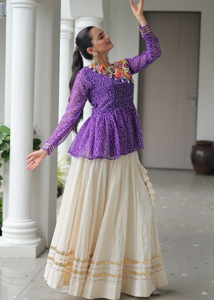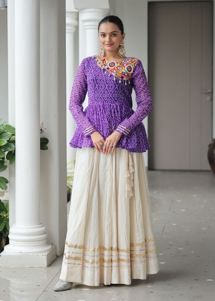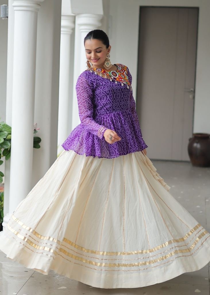 NAME : | Navratri Festival Kora Cotton With Attractive Gota-Patti Lace With Bandhani Print Tops Lehenga Purple Color DN 1184 |