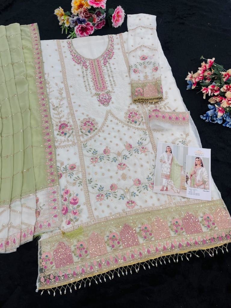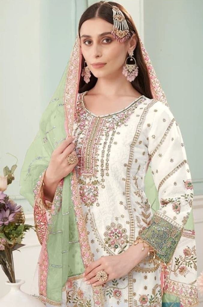 | NAME : | Pakistani Maria A Catalogue Heavy Faux Georgette Suit With Khatli And Sequence Embroidery Work White And Mint Green DN 1197 |