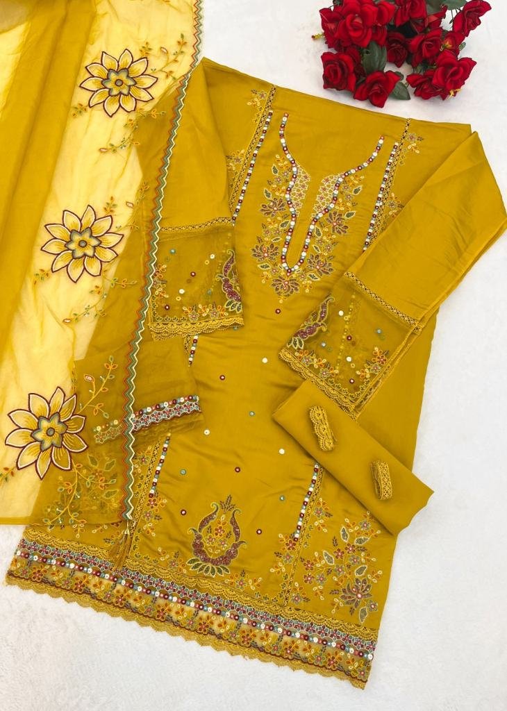 | NAME : | Pakistani Suit PV Cotton With Heavy Embroidered Viscose Multi Thread Zari Sequence Work Mustard Yellow Color DN 723 |
