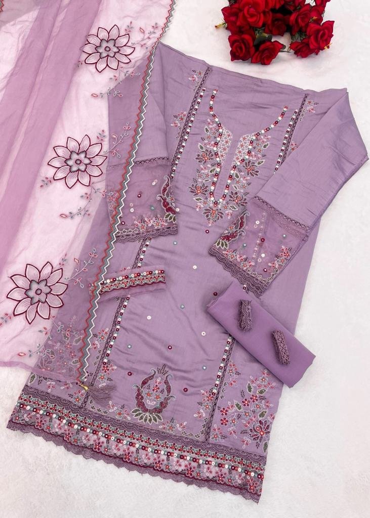 | NAME : | Pakistani Suit PV Cotton With Heavy Embroidered Viscose Multi Thread Zari Sequence Work lavender Color DN 723 |