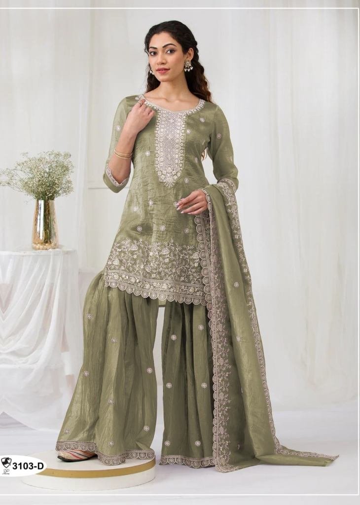 | NAME : | Palazzo Suit Fancy Gold Crush with Heavy Embroidery Sequence Work Mehndi Colour DN 3103 |