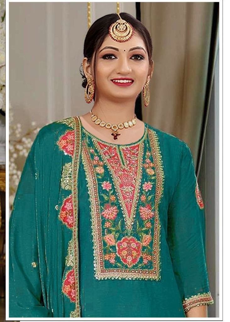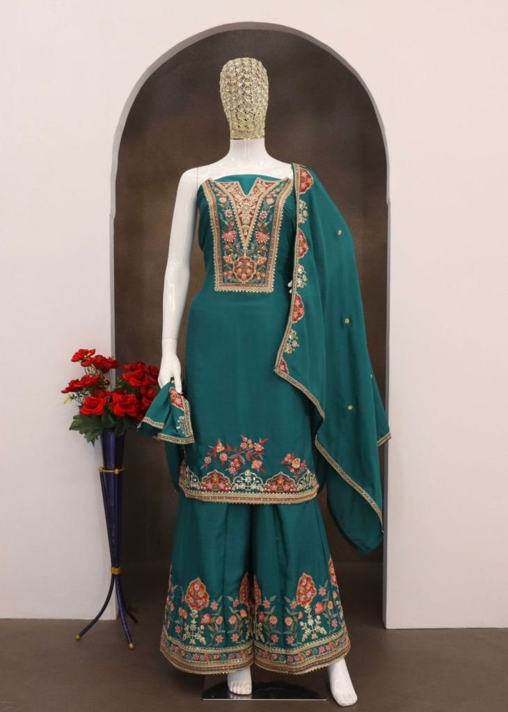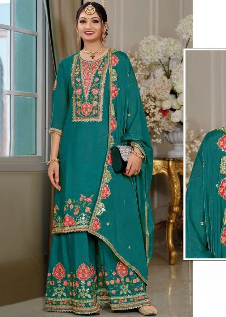 | NAME : | Palazzo Suit Heavy Chinon With Embroidery Sequence Work And Diamond Work Green Color DN 1188 |