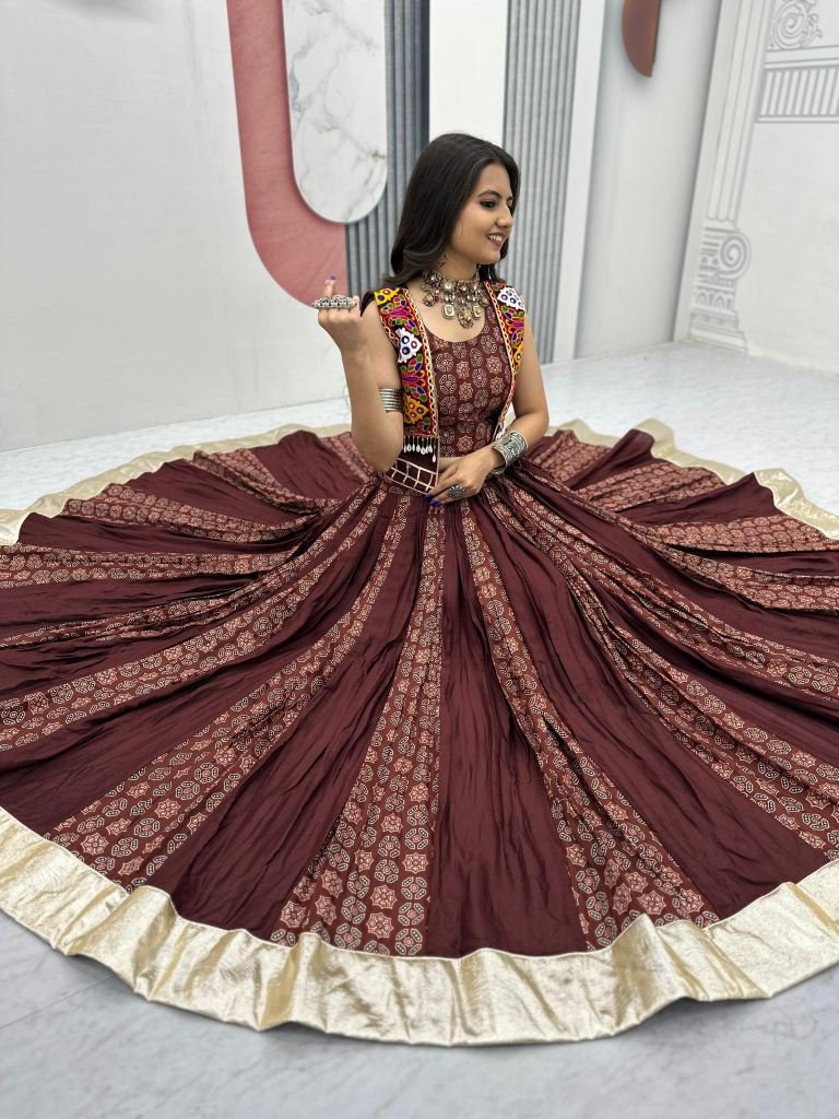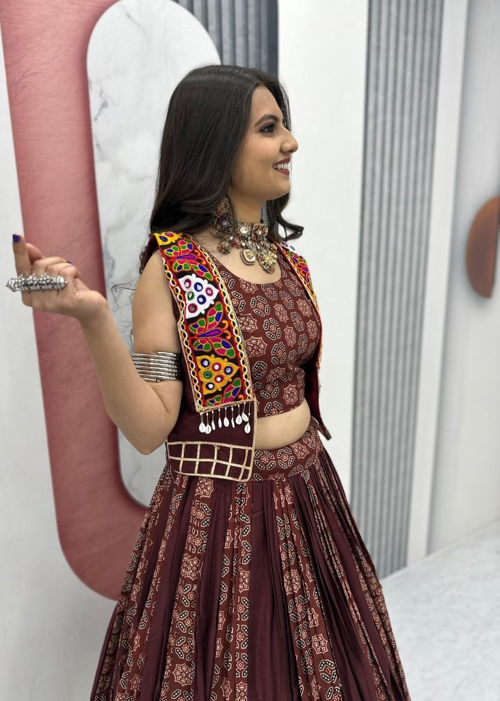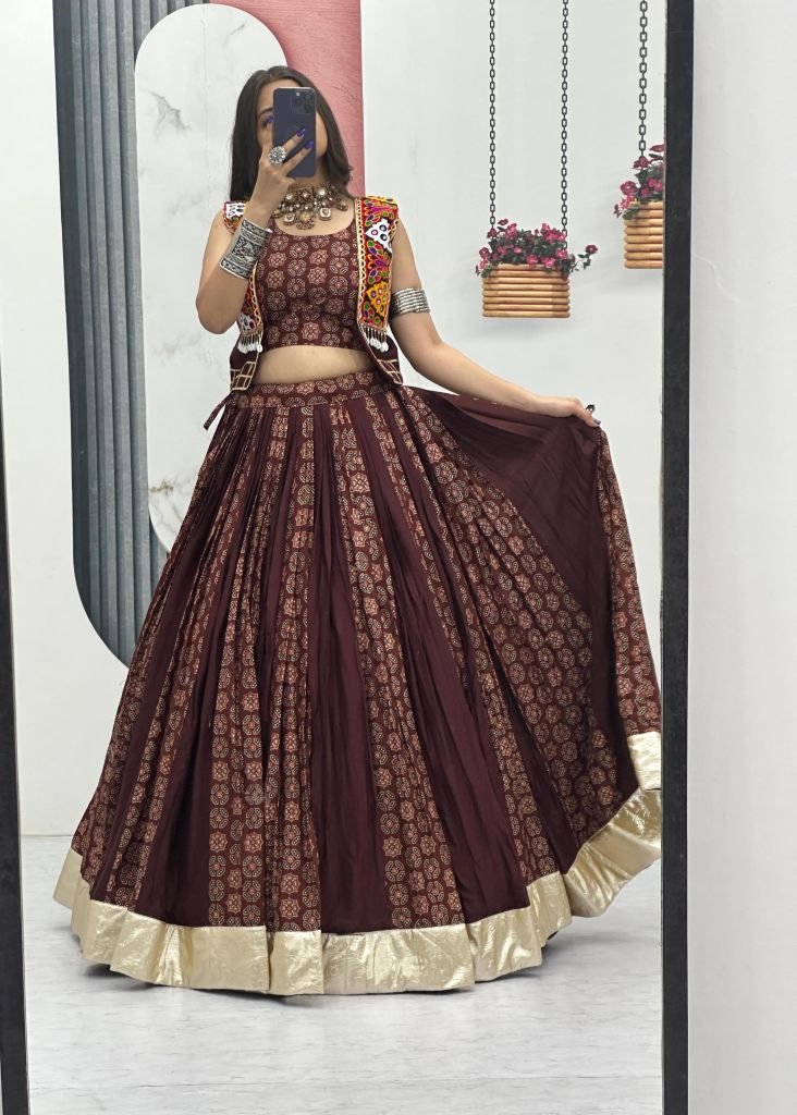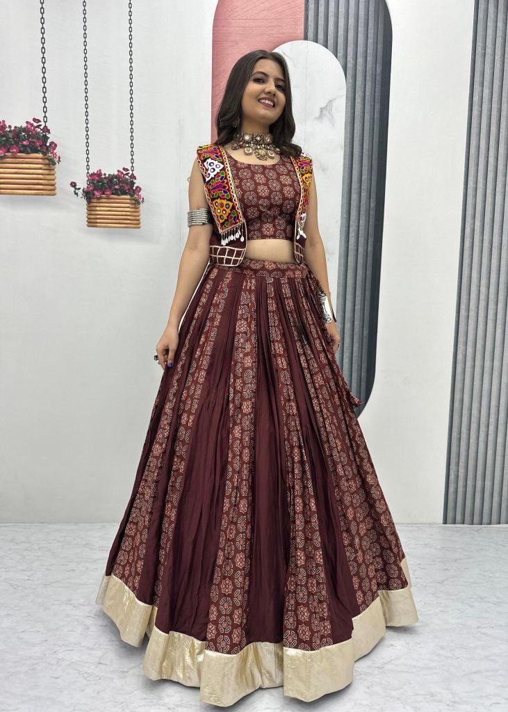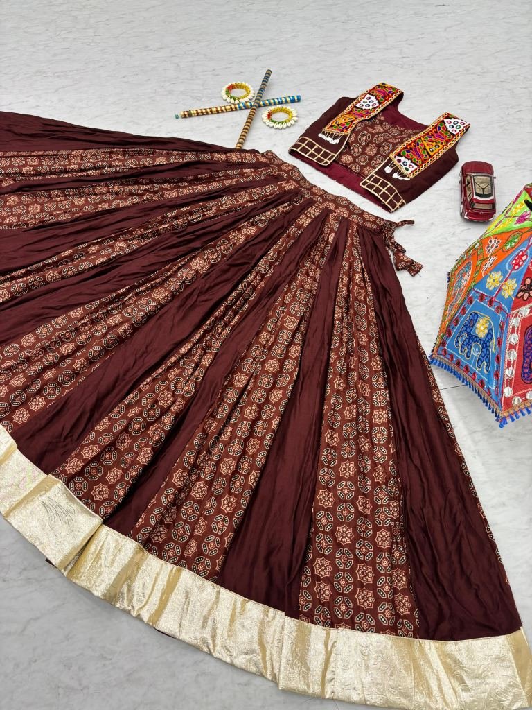 NAME : | Popular Navratri Dandiya Special Cotton Ajrakh Print And Lumpi Lace Border With Jacket Lehenga Choli Brown Color |