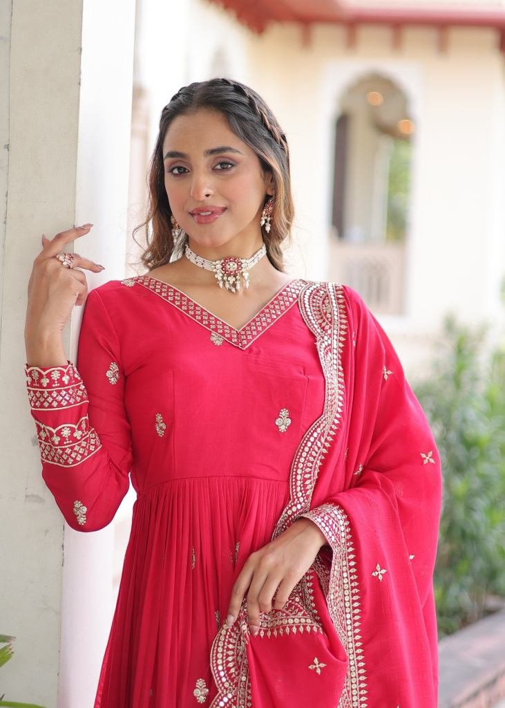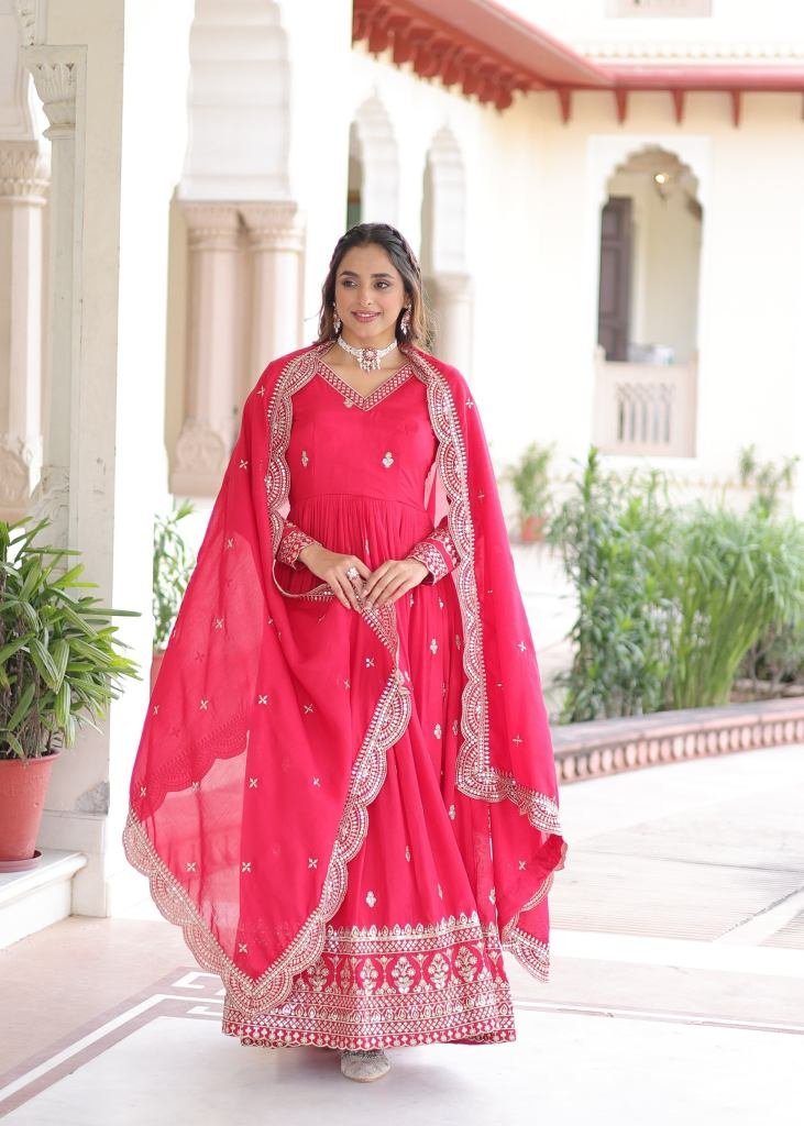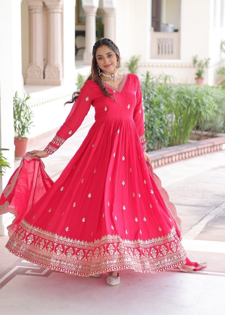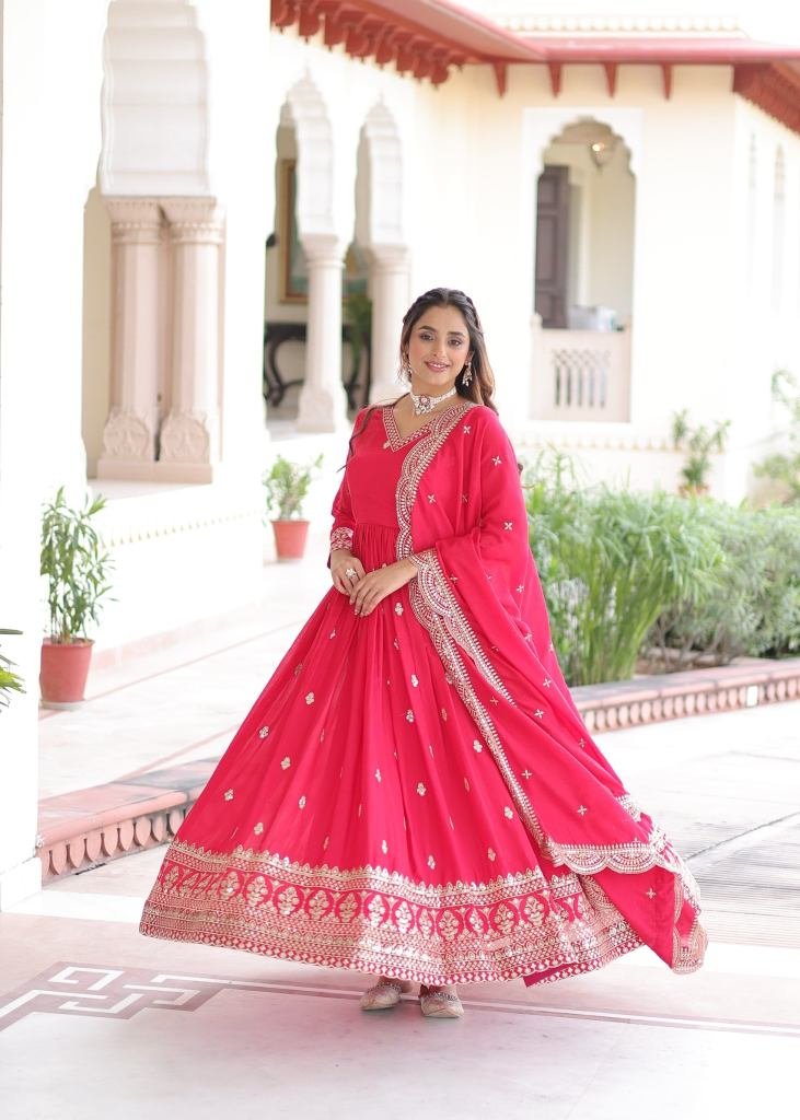 | NAME : | Premium And Elegant Vichitra Silk Heavy Sequence And Zari Embroidered Work Anarkali Gown Rani Color LW DN 9281 |