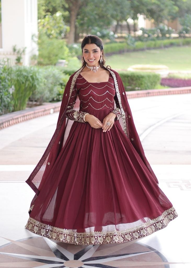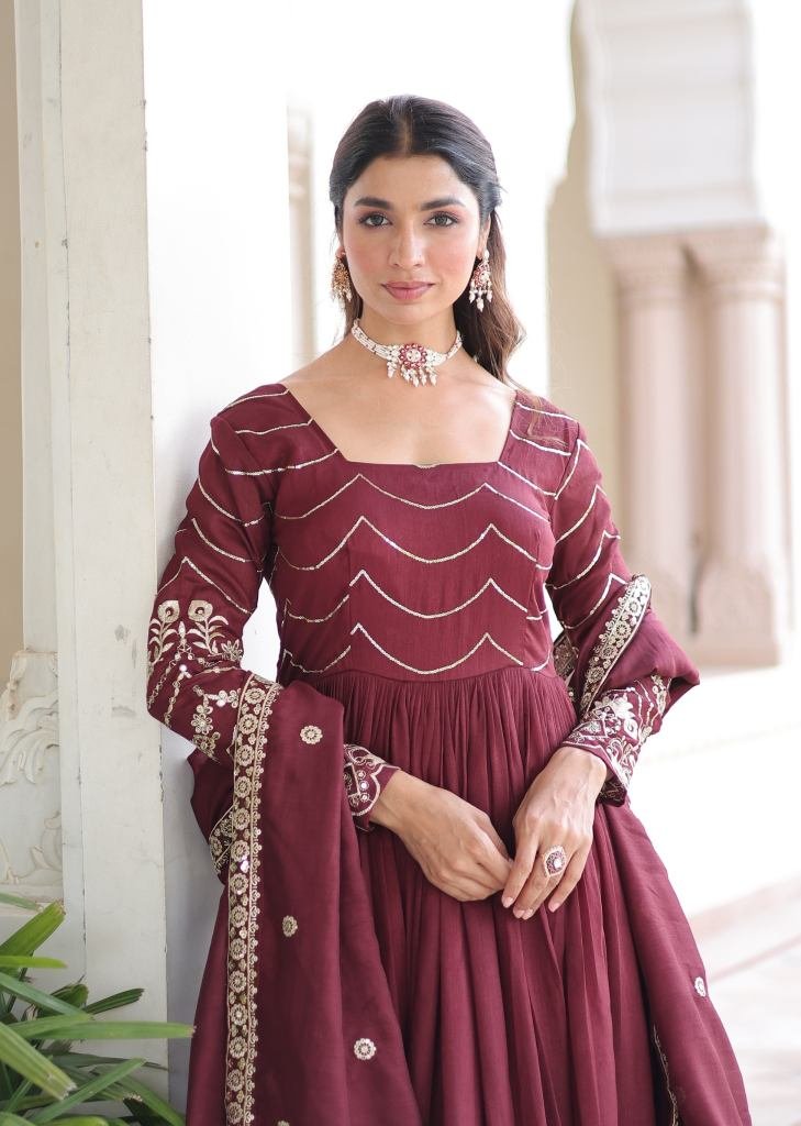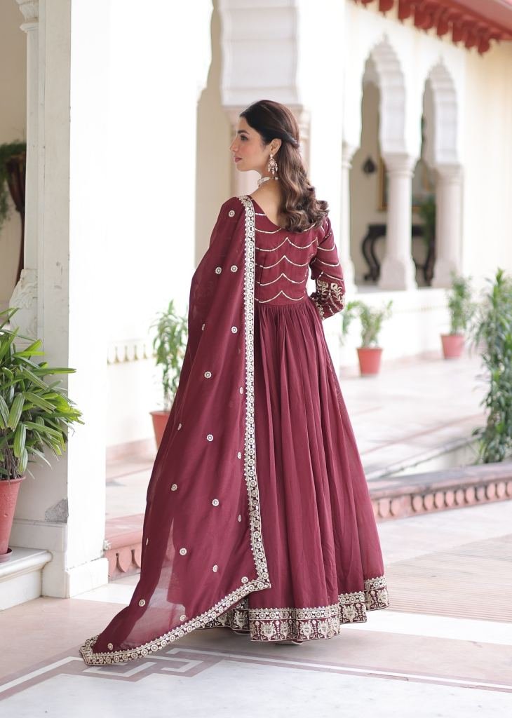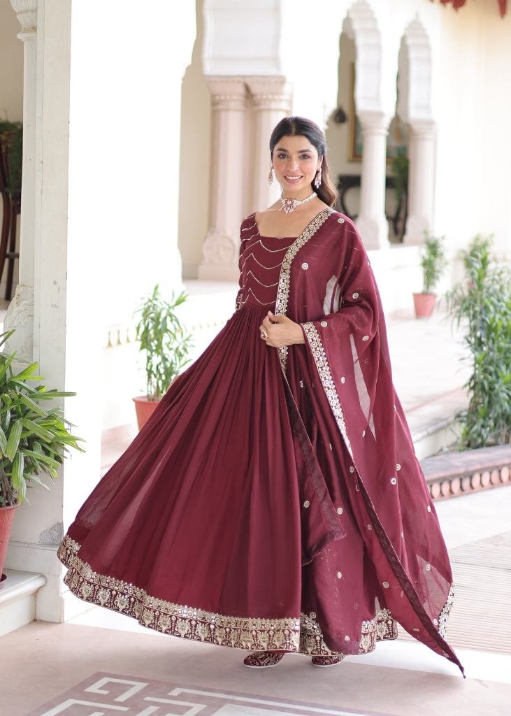 | NAME : | Premium And Elegant Vichitra Silk Heavy Sequence And Zari Embroidered Work Anarkali Gown Mehndi Maroon Color KA DN 1208 |