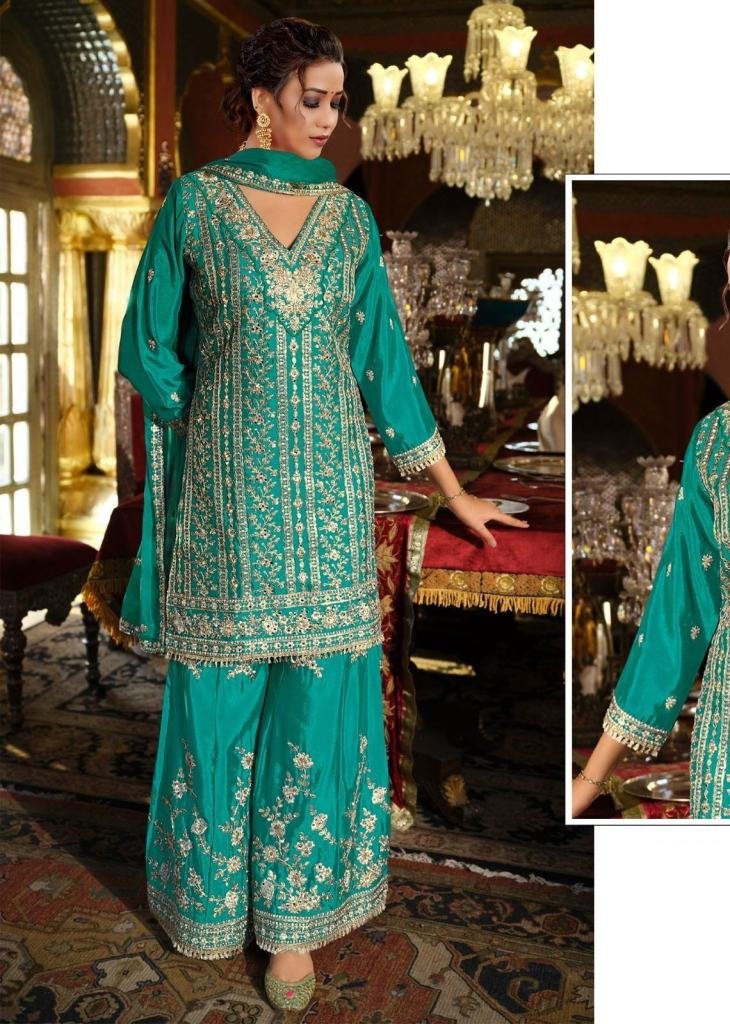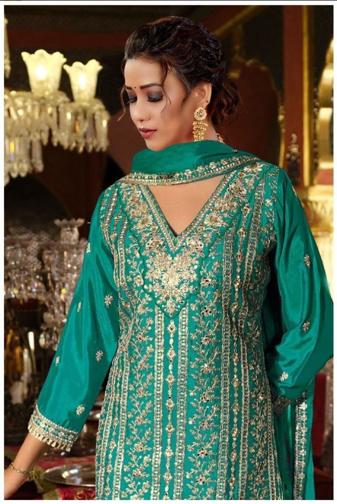 | NAME : | Premium Designer Heavy Chinon With Embroidery Codding Sequence Work With Real Mirror Palazzo Suit Teal Green Color DN 1191 |