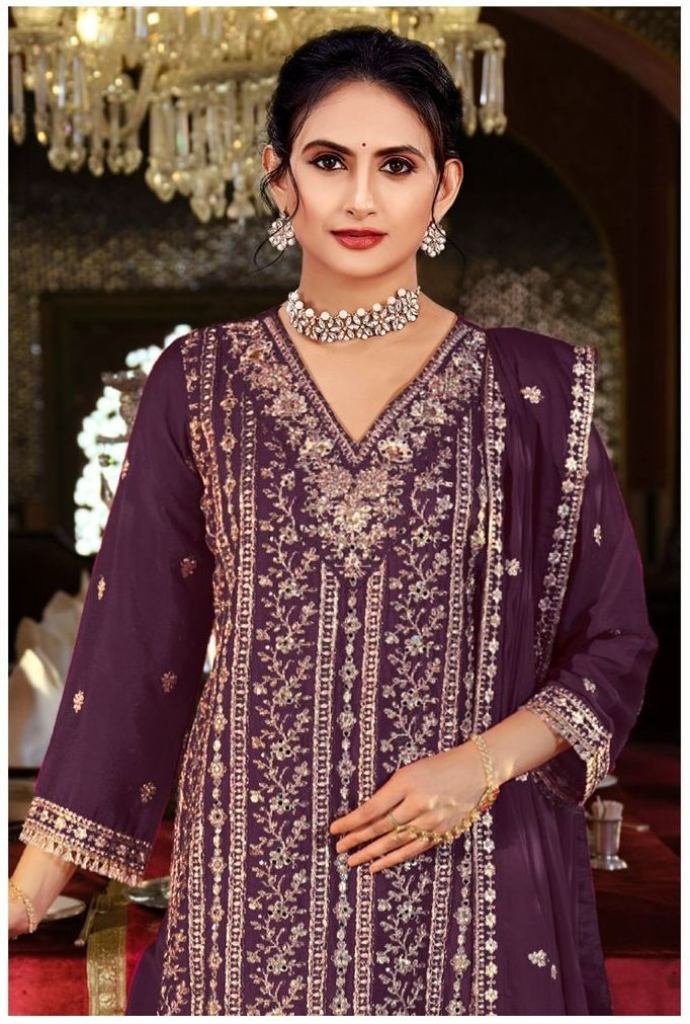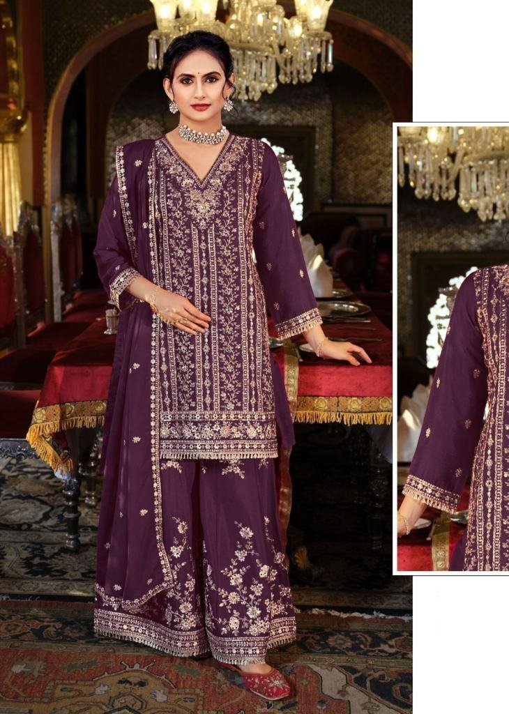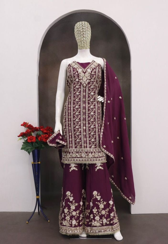 | NAME : | Premium Designer Heavy Chinon With Embroidery Codding Sequence Work With Real Mirror Palazzo Suit Wine Color DN 1191 |