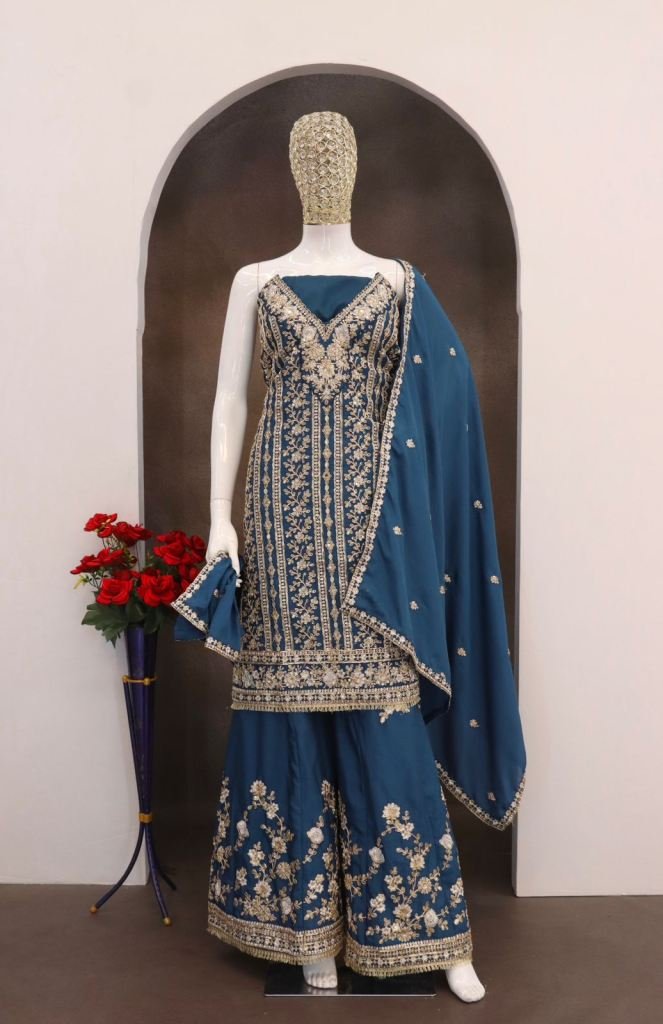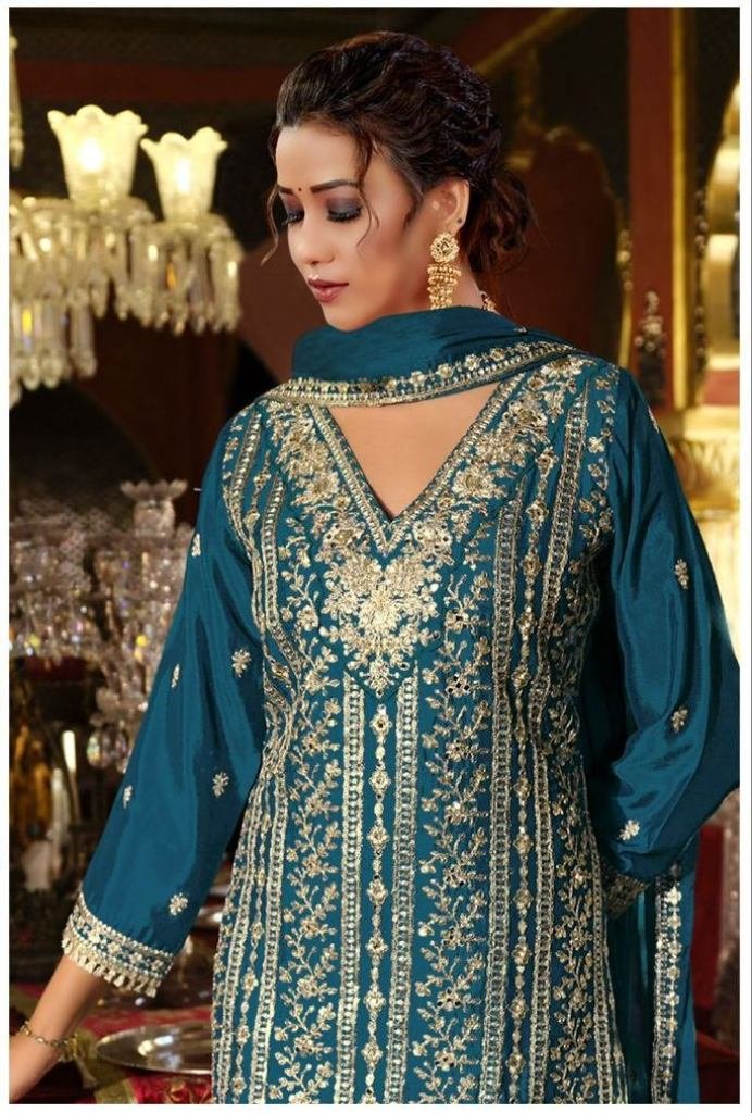 | NAME : | Premium Designer Heavy Chinon With Embroidery Codding Sequence Work With Real Mirror Palazzo Suit Teal Blue Color DN 1191 |