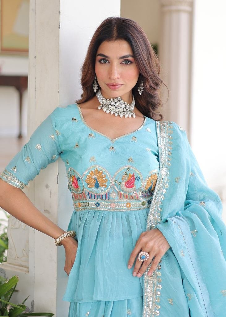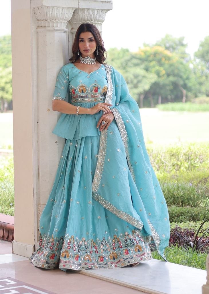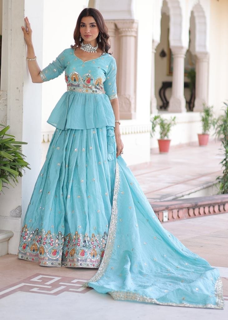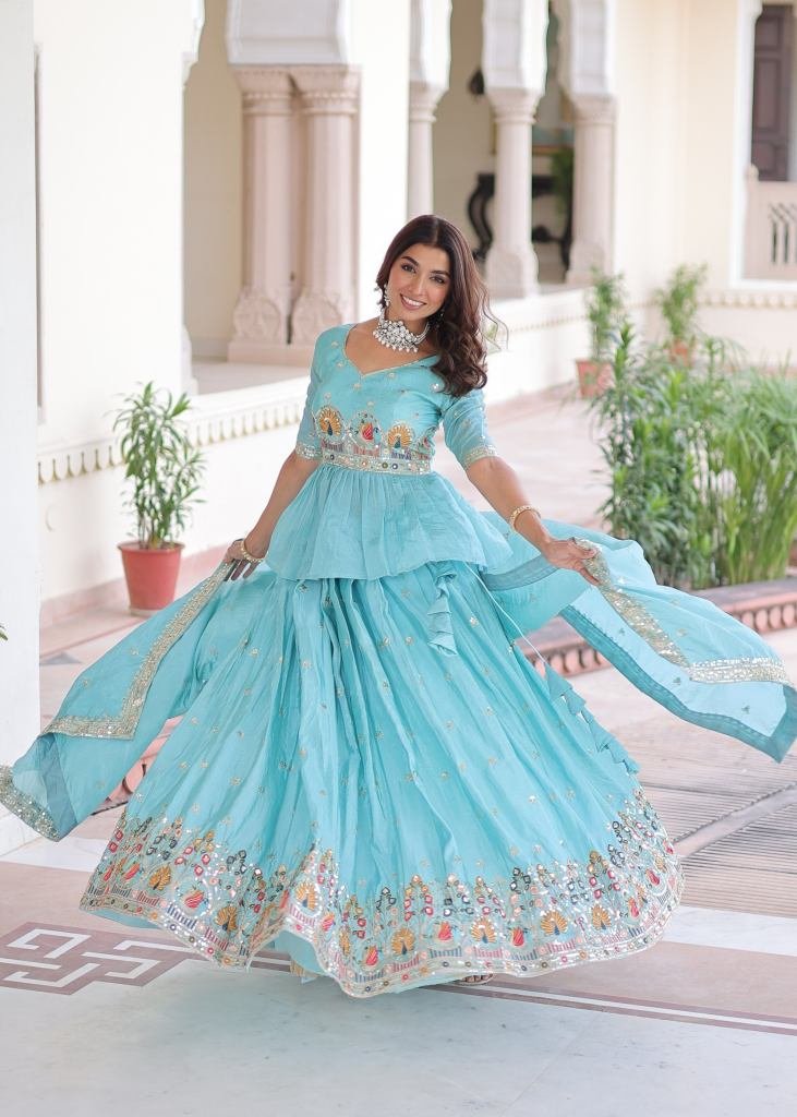 | NAME : | Premium Designer Ready Made Lehenga choli Set Gold Crush With Multi Thread Embroidery Zari Sequins-Work Sky Blue Color KA DN 5058 |