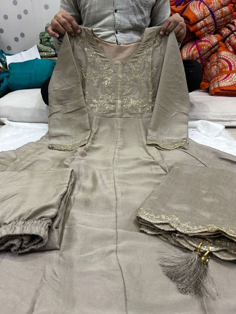 Premium Fully Stitched Anarkali Suit With Vichitra Silk And Intricate Cording Work Beige Color