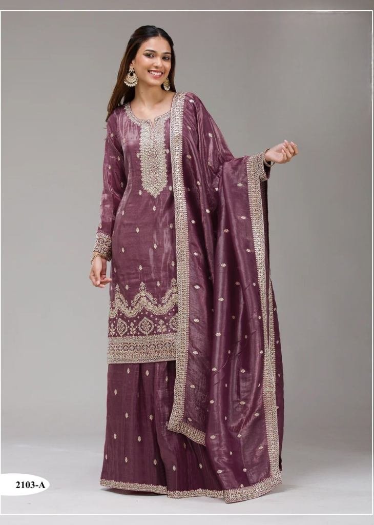 | NAME : | Premium Product Fancy Gold Crush With Heavy Embroidery Work And Sequence Work Palazzo Suit Purple Color DN 2103 |