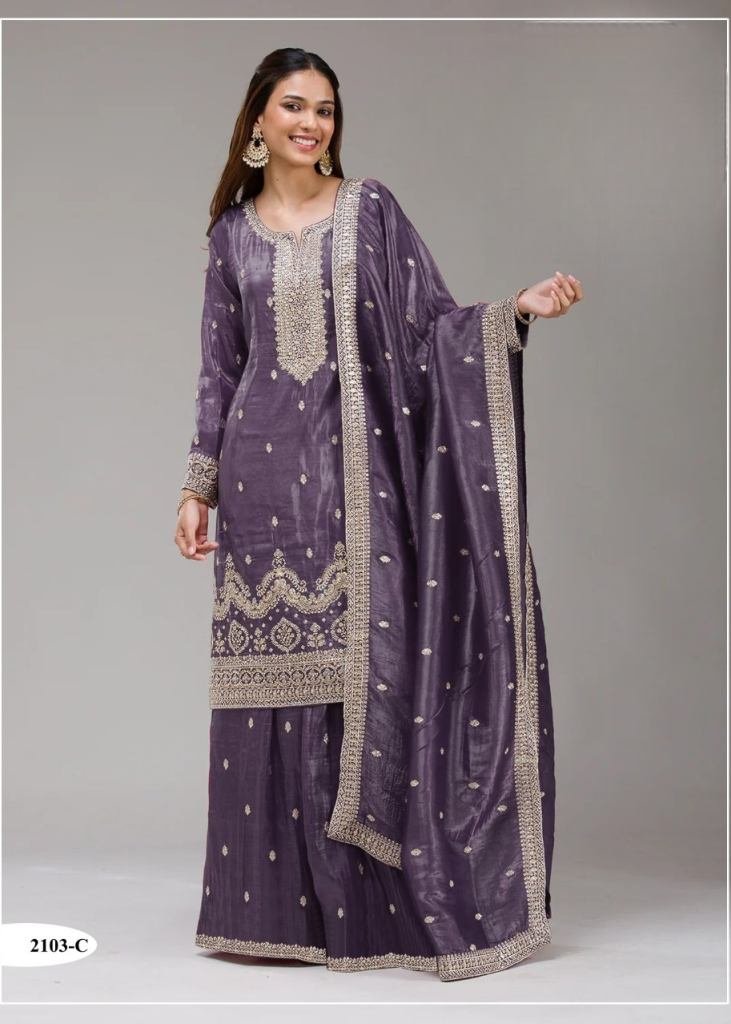 | NAME : | Premium Product Fancy Gold Crush With Heavy Embroidery Work And Sequence Work Palazzo Suit Lavender Color DN 2103 |