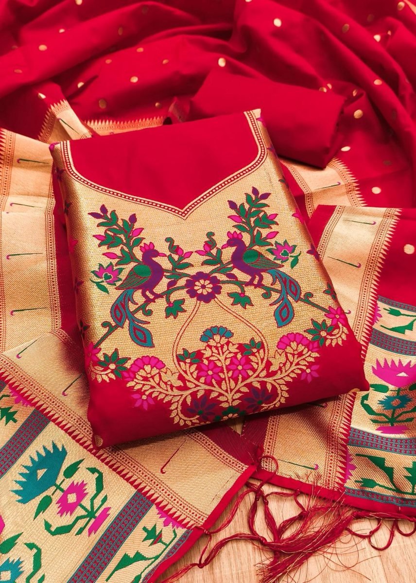 | NAME : | Premium Pure Zari Soft Banarasi Silk Suit Dress Material In Red Color |