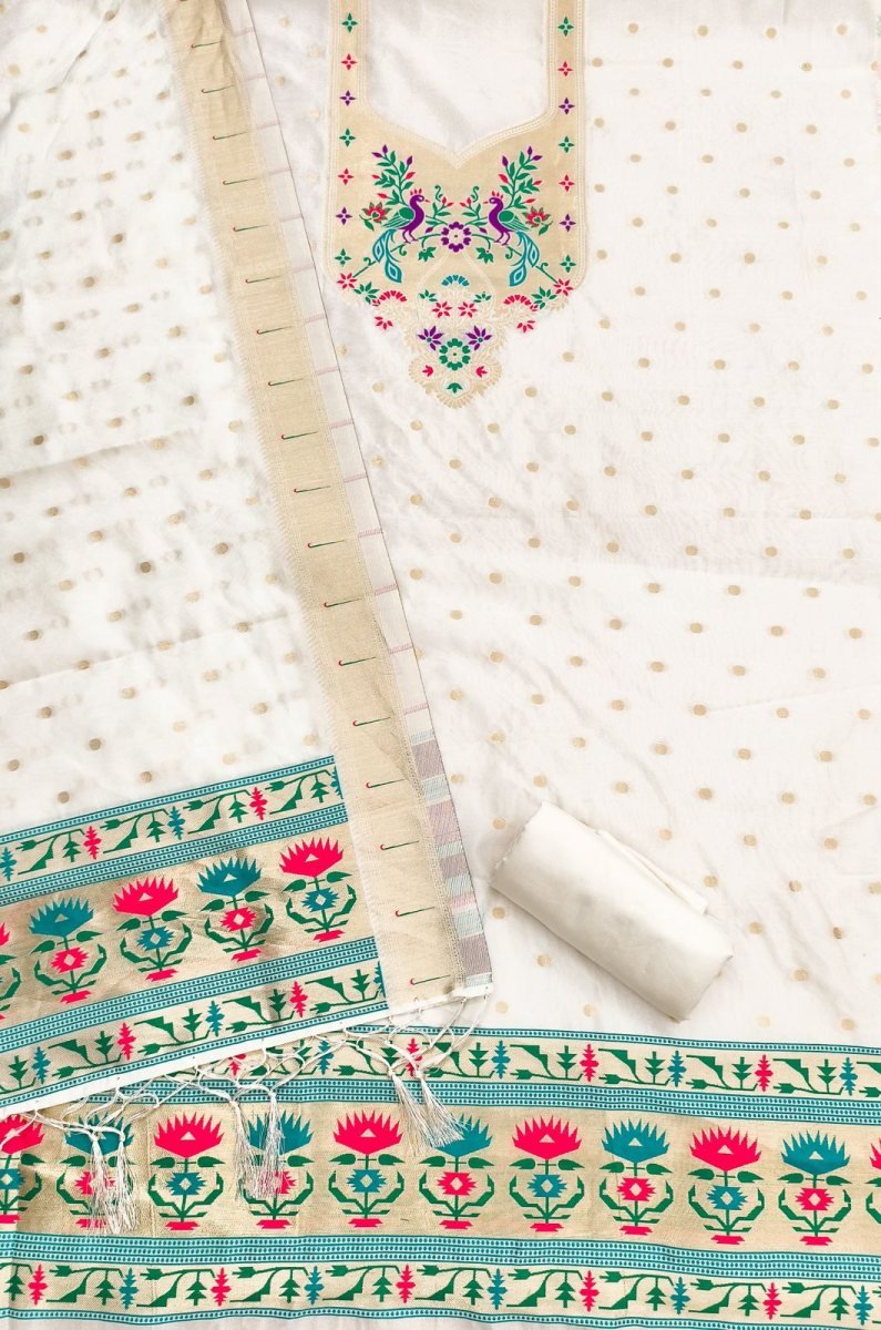 | NAME : | Premium Pure Zari Soft Banarasi Silk Suit Dress Material In white Color |