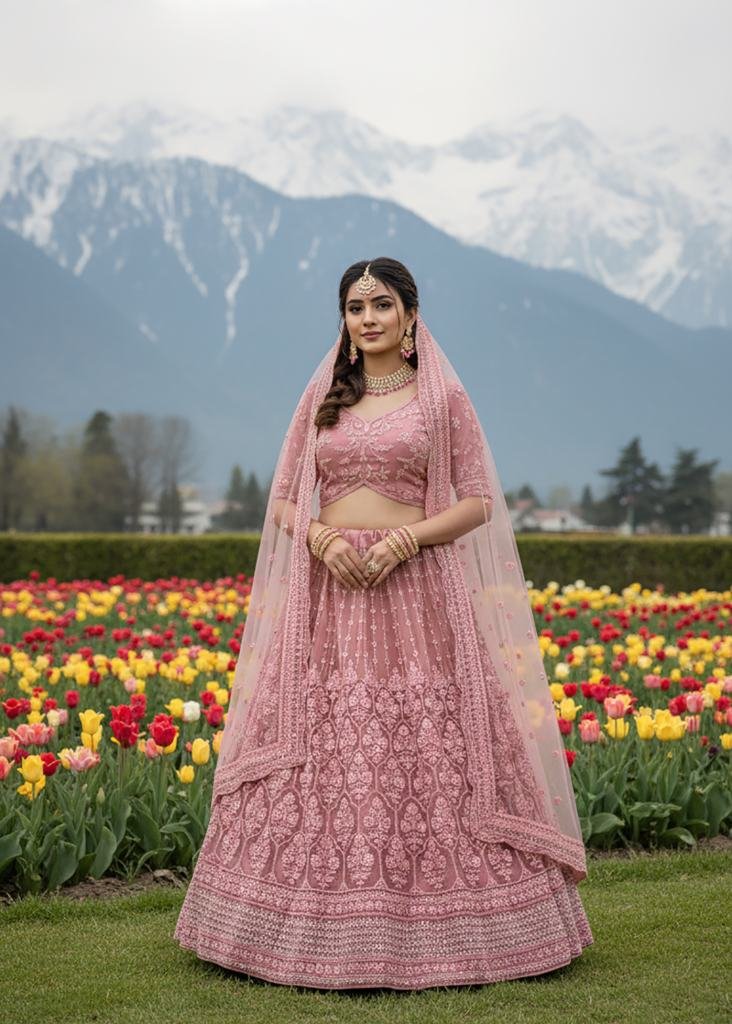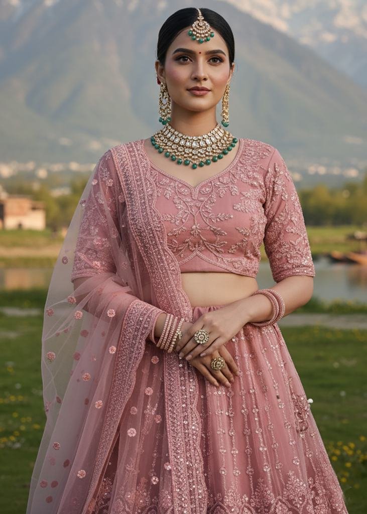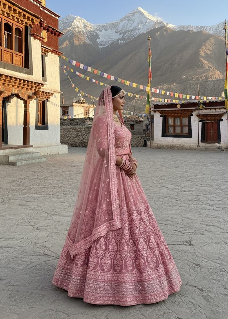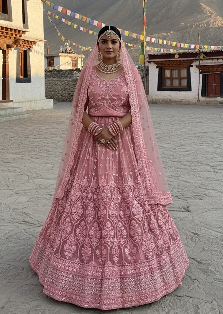 | NAME : | Premium Wedding Lehenga Choly Pure Butterfly Net With Embroidery Work And Diamond Work Dusty Pink Color SN DN 7101 |
