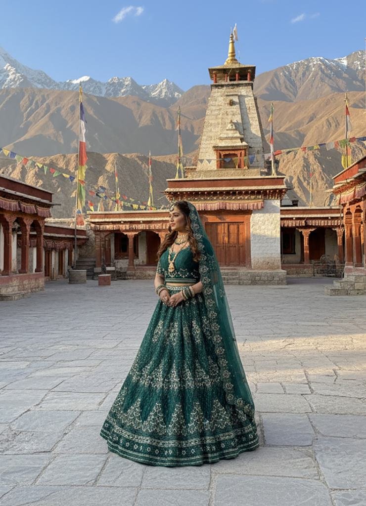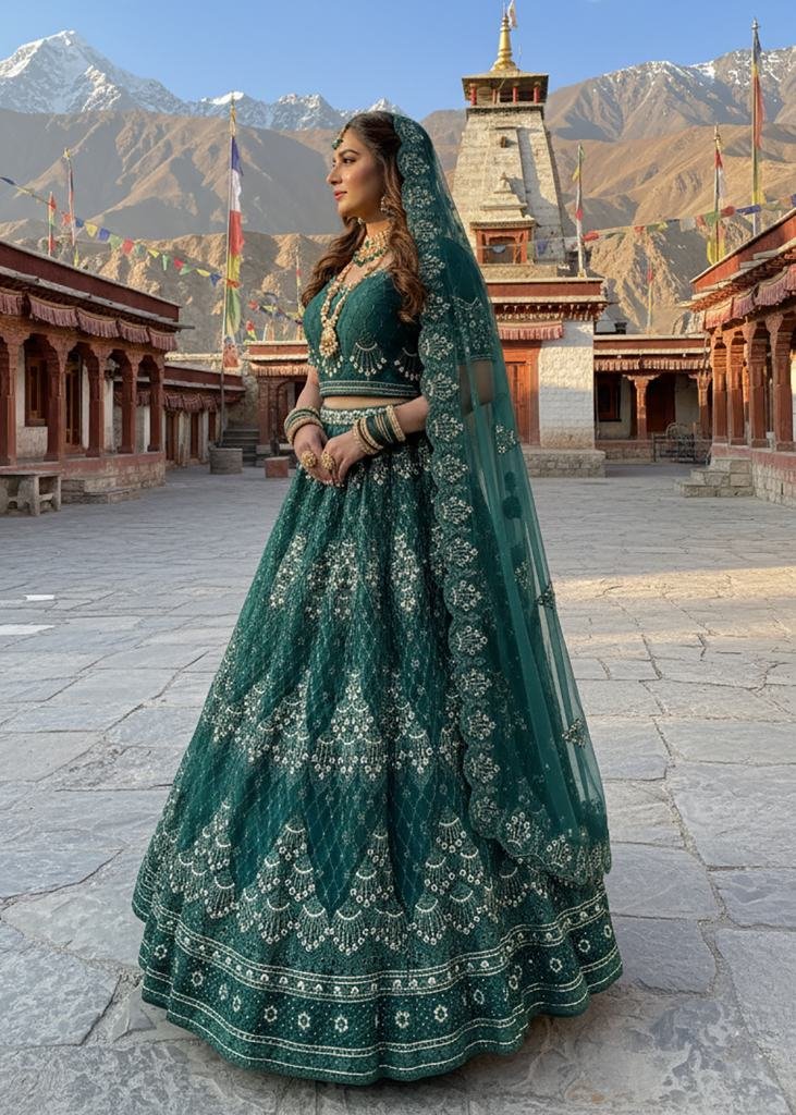 | NAME : | Premium Wedding Lehenga Choly Pure Butterfly Net With Embroidery Work And Diamond Work Dark Green Color SN DN 7102 |