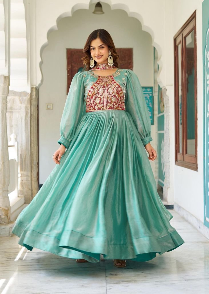 Presenting New Festival Long Anarkali Gown Dupptta Fendy silk With Heavy sequence & Thread Embroidery Work Aqua Blue Color RM DN 146