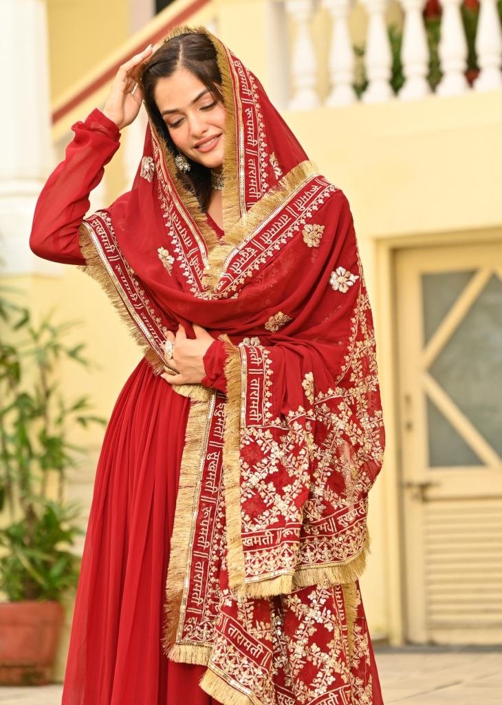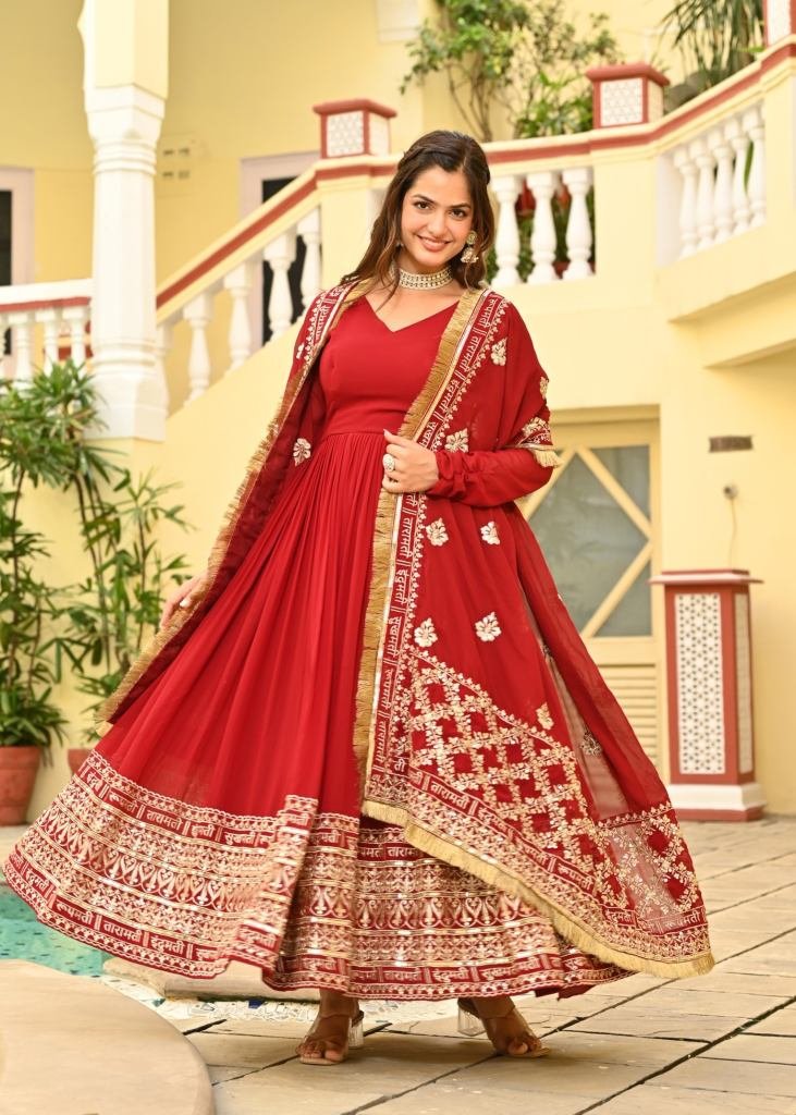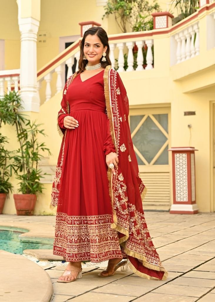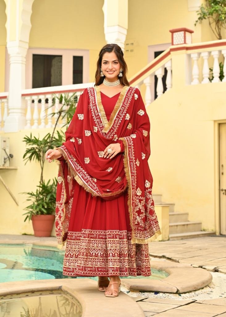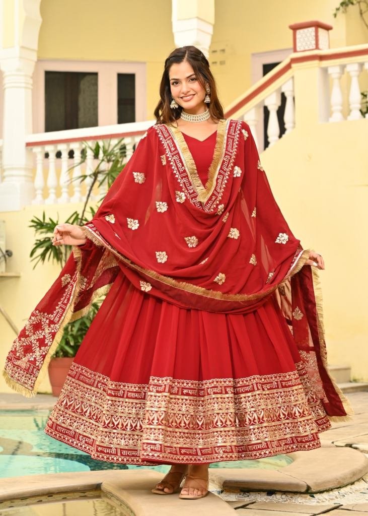 | NAME : | Presenting Party Wear Anarkali Gown Faux Blooming With Embroidery Sequence Work Red Color KA DN 1207 |