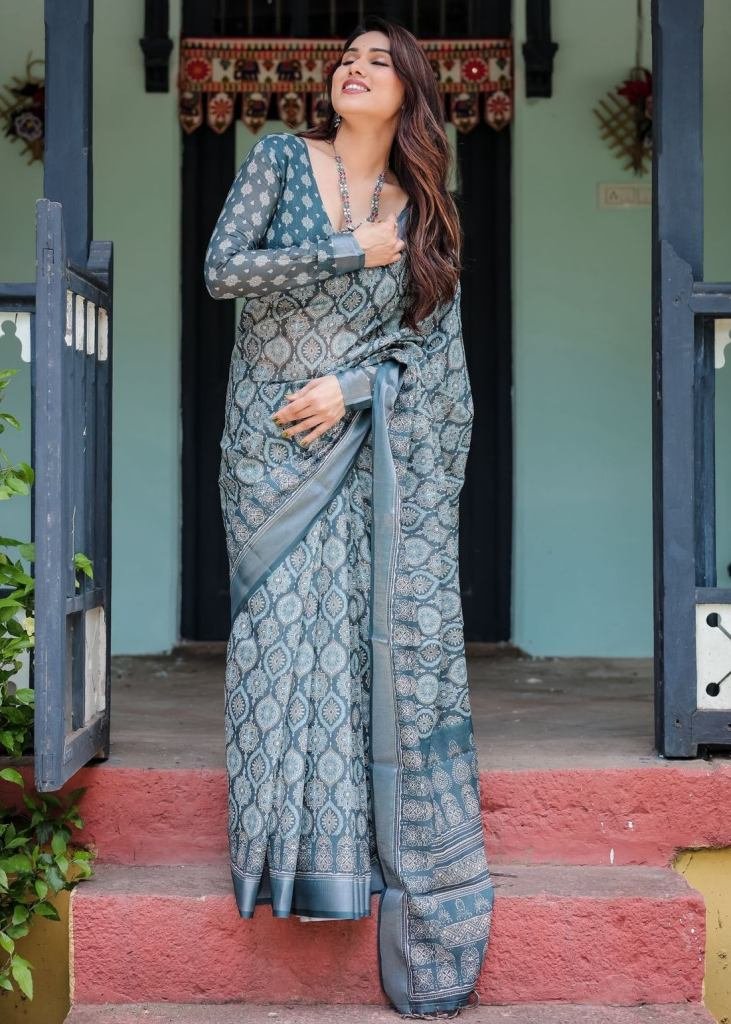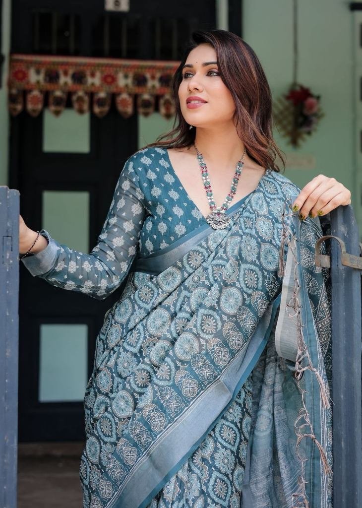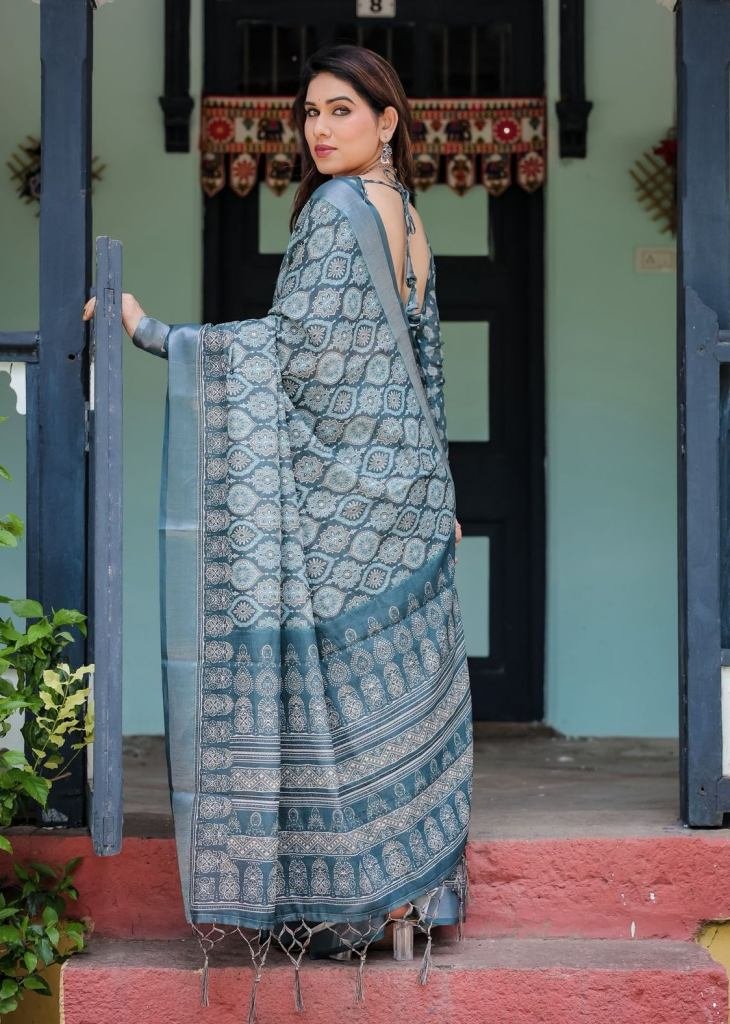Presenting Pure Linen Saree With Tassels Deep Teal Blue With Intricate Paisley And Floral Prints Teal Blue Color DN 119